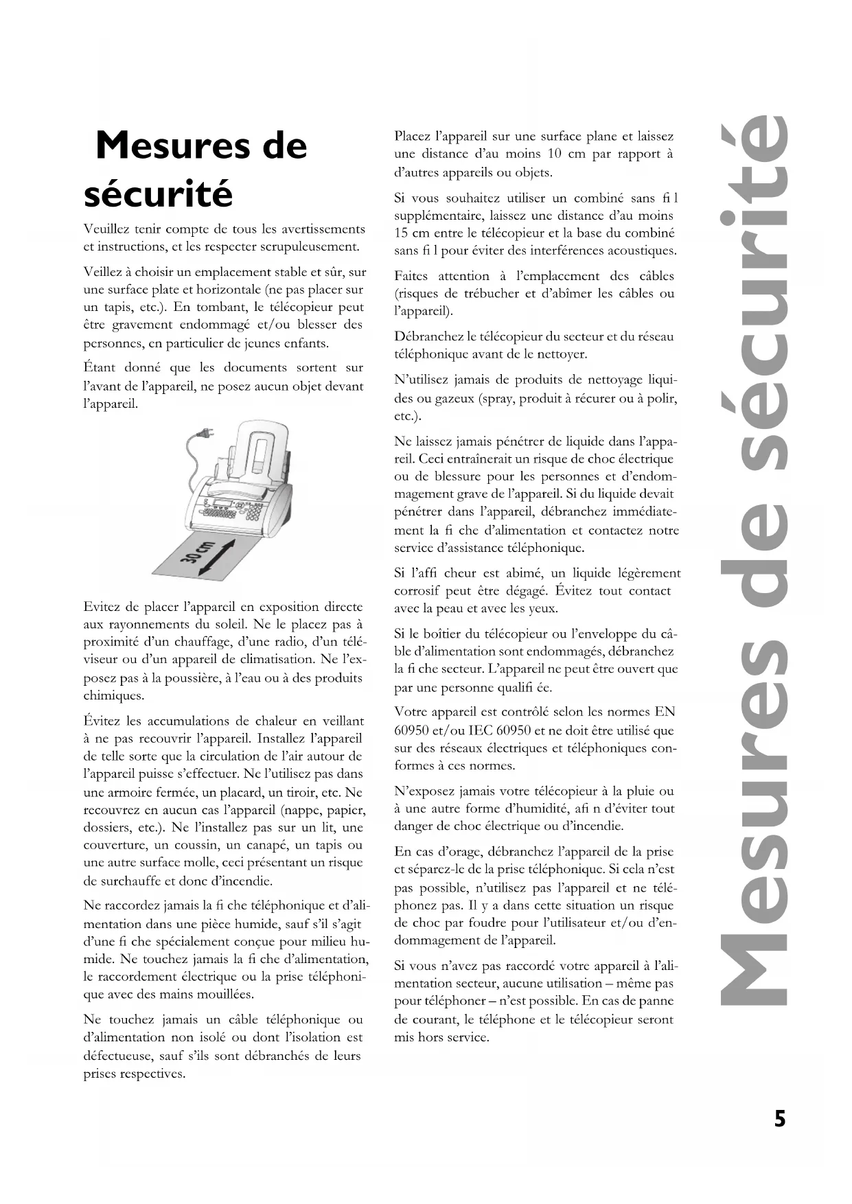 - Index Mesures de sécurité Mesures de sécurité Veuillez tenir compte de tous les avertissements et instructions, et les respecter scrupuleusement. Veillez à choisir un emplacement stable et sûr, sur une surface plate et horizontale (ne pas placer sur un tapis, etc.). En tombant, le télécopieur peut être gravement endommagé et/ou blesser des personnes, en particulier de jeunes enfants. Étant donné que les documents sortent sur l’avant de l’appareil, ne posez aucun objet devant l’appareil. Evitez de placer l’appareil en exposition directe aux rayonnements du soleil. Ne le placez pas à proximité d’un chauffage, d’une radio, d’un télé- viseur ou d’un appareil de climatisation. Ne l’ex- posez pas à la poussière, à l’eau ou à des produits chimiques. Évitez les accumulations de chaleur en veillant à ne pas recouvrir l’appareil. Installez l’appareil de telle sorte que la circulation de l’air autour de l’appareil puisse s’effectuer. Ne l’utilisez pas dans une armoire fermée, un placard, un tiroir, etc. Ne recouvrez en aucun cas l’appareil (nappe, papier, dossiers, etc.). Ne l’installez pas sur un lit, une couverture, un coussin, un canapé, un tapis ou une autre surface molle, ceci présentant un risque de surchauffe et donc d’incendie. Ne raccordez jamais la fi che téléphonique et d’ali- mentation dans une pièce humide, sauf s’il s’agit d’une fi che spécialement conçue pour milieu hu- mide. Ne touchez jamais la fi che d’alimentation, le raccordement électrique ou la prise téléphoni- que avec des mains mouillées. Ne touchez jamais un câble téléphonique ou d’alimentation non isolé ou dont l’isolation est défectueuse, sauf s’ils sont débranchés de leurs prises respectives. Placez l’appareil sur une surface plane et laissez une distance d’au moins 10 cm par rapport à d’autres appareils ou objets. Si vous souhaitez utiliser un combiné sans fi l supplémentaire, laissez une distance d’au moins 15 cm entre le télécopieur et la base du combiné sans fi l pour éviter des interférences acoustiques. Faites attention à l’emplacement des câbles (risques de trébucher et d’abîmer les câbles ou l’appareil). Débranchez le télécopieur du secteur et du réseau téléphonique avant de le nettoyer. N’utilisez jamais de produits de nettoyage liqui- des ou gazeux (spray, produit à récurer ou à polir, etc.). Ne laissez jamais pénétrer de liquide dans l’appa- reil. Ceci entraînerait un risque de choc électrique ou de blessure pour les personnes et d’endom- magement grave de l’appareil. Si du liquide devait pénétrer dans l’appareil, débranchez immédiate- ment la fi che d’alimentation et contactez notre service d’assistance téléphonique. Si l’affi cheur est abimé, un liquide légèrement corrosif peut être dégagé. Évitez tout contact avec la peau et avec les yeux. Si le boîtier du télécopieur ou l’enveloppe du câ- ble d’alimentation sont endommagés, débranchez la fi che secteur. L’appareil ne peut être ouvert que par une personne qualifi ée. Votre appareil est contrôlé selon les normes EN 60950 et/ou IEC 60950 et ne doit être utilisé que sur des réseaux électriques et téléphoniques con- formes à ces normes. N’exposez jamais votre télécopieur à la pluie ou à une autre forme d’humidité, afi n d’éviter tout danger de choc électrique ou d’incendie. En cas d’orage, débranchez l’appareil de la prise et séparez-le de la prise téléphonique. Si cela n’est pas possible, n’utilisez pas l’appareil et ne télé- phonez pas. Il y a dans cette situation un risque de choc par foudre pour l’utilisateur et/ou d’en- dommagement de l’appareil. Si vous n’avez pas raccordé votre appareil à l’ali- mentation secteur, aucune utilisation – même pas pour téléphoner – n’est possible. En cas de panne de courant, le téléphone et le télécopieur seront mis hors service.6 Installation Installation Déballage L’emballage contient les éléments décrits ci-des- sous : 1 Manuel d’utilisation 2 Guide d’installation 3 Plateau à papier 4 Support de documents 5 Combiné 6 Câble spiralé du combiné 7 Télécopieur 8 Câble d’alimentation avec fi che 9 Câble téléphonique 10 Fiche téléphonique p. 395