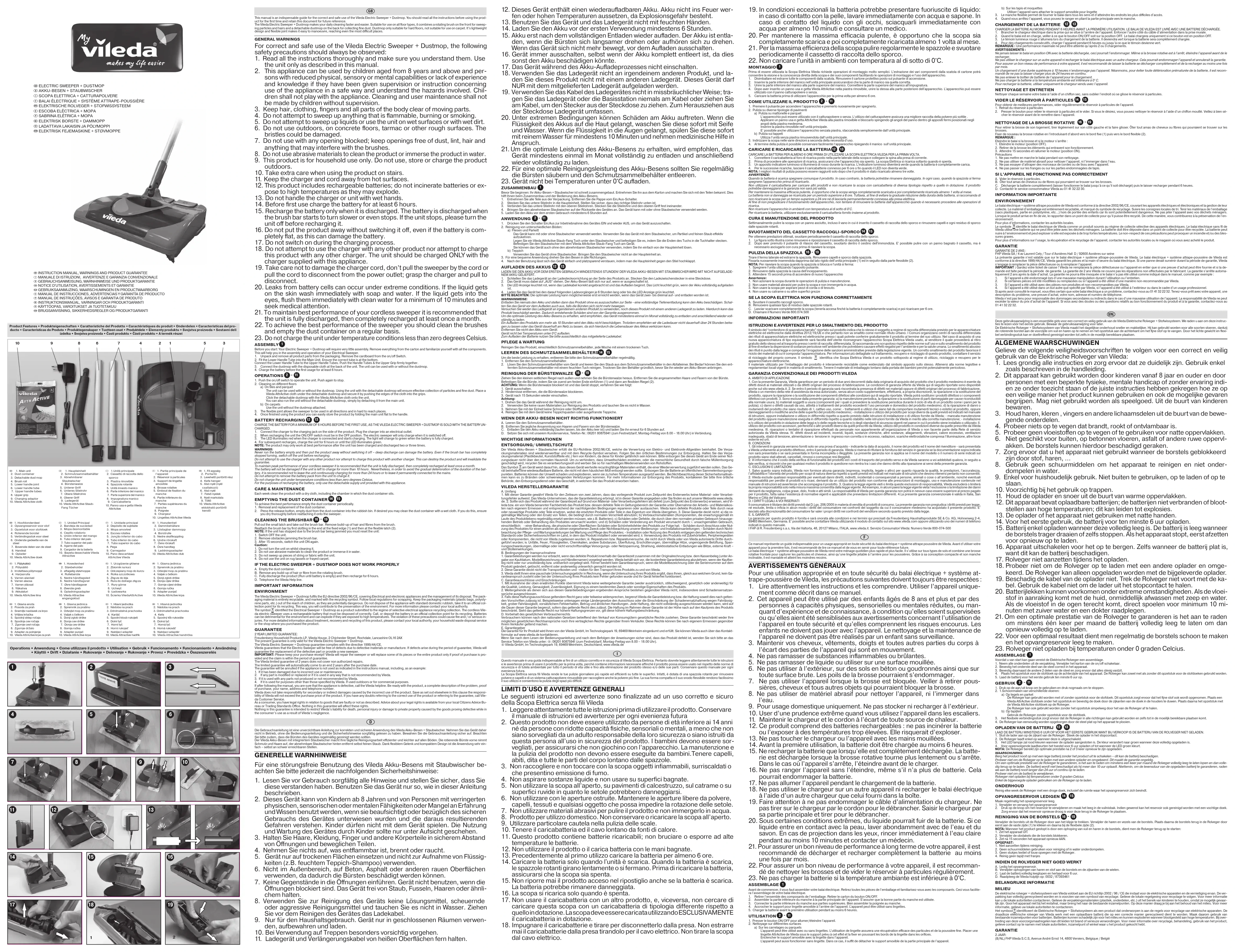 Pour retirer la brosse de son logement, tirer légèrement sur son côté gauche et la faire glisser. Ôter tout amas de cheveux ou fibres qui pourraient se trouver sur les brosses.Fixer de nouveau la brosse rotative en l’introduisant d’abord vers le bord fixe (1) puis vers le bord flexible (2).REMARQUE :Eteindre le balai si la brosse et si le moteur s’arrête :1. Eteindre le moteur (position OFF).2. Retirer de la brosse les éléments qui entravent son fonctionnement.3. Attendre 15 secondes et rallumer le moteur (position ON).Précautions1. Ne pas mettre en marche le balai pendant son nettoyage.2. Ne pas utiliser de matériel abrasif pour nettoyer l’appareil, ni l’immerger dans l’eau.3. Ne pas essayer d’attraper des morceaux de cordes ou de tissu avec l’appareil.4. Ne pas passer sur les franges ou sur les parties endommagées de tapis. SI L’APPAREIL NE FONCTIONNE PAS CORRECTEMENT A. Vider le réservoir à particules.B. Ôter tout amas de cheveux ou de fibres qui pourraient se trouver sur les brosses. C. Décharger la batterie complètement (laisser fonctionner le balai jusqu’à ce qu’il soit déchargé) puis le laisser recharger pendant 6 heures. D. Contacter le service consommateur Vileda au 01 41 32 22 30. INFORMATION IMPORTANTE ENVIRONNEMENT Le balai électrique + système attrape poussière de Vileda est conforme à la directive 2002/96/CE, couvrant les appareils électriques et électroniques et la gestion de leur collecte. Le matériel d’emballage est entièrement recyclable, et marqué du symbole de recyclage. Suivre les consignes locales de tri. Tenir les matériaux de l’emballage (sacs plastiques, partie en polystyrène, etc...) hors de portée des enfants car ils sont potentiellement dangereux. Ne pas jeter l’appareil avec vos déchets ménagers. Lorsque le produit arrive en fin de vie, le rapporter dans un point de collecte pour qu’il puisse être recyclé. De cette manière, vous contribuerez à la préservation de l’en- vironnement. Pour plus d’informations, contacter les autorités locales. Le symbole identifie le balai électrique de Vileda comme un produit soumis au régime de collecte sélective des appareils électriques. Le balai électrique sans fil de Vileda utilise une batterie qui ne peut être jetée avec les déchets ménagers. La batterie doit être déposée dans un point de collecte pour être recyclée. La batterie peut nuire à l’environnement et peut exploser si elle est exposée à de trop fortes températures. Le non-respect de ces précautions peut provoquer un incendie et/ou des bles- sures graves. Pour plus d’informations sur l’usage, la récupération et le recyclage de l’appareil, contacter les autorités locales ou le magasin où vous avez acheté le produit. GARANTIE GARANTIE DE 2 ANS : FHP Vileda SA / 4 av Laurent Cely / Tour d’Asnières Hall D / 92600 Asnières sur seine La présente garantie n’est valable que sur le balai électrique + système attrape-poussière de Vileda. Le balai électrique + système attrape-poussière de Vileda est conforme à la directive 1999/44/CE. Vileda garantit les pièces et la main-d’œuvre du balai électrique. Si une panne devait survenir durant la période de garantie, Vileda s’engage à remplacer la pièce défectueuse ou à remplacer l’appareil. IMPORTANT : Gardez votre ticket de caisse ! Vileda ne remplacera la pièce défectueuse ou l’appareil en entier que si une preuve d’achat peut être fournie et si la de- mande est faite pendant la période de garantie. La garantie de 2 ans Vileda ne couvre pas les réparations non effectuées par le fabricant. La garantie s’arrête automa- tiquement 2 ans après la date d’achat. La garantie ne pourra être invoquée si le balai n’a pas été utilisé comme indiqué dans le manuel, comme par exemple :