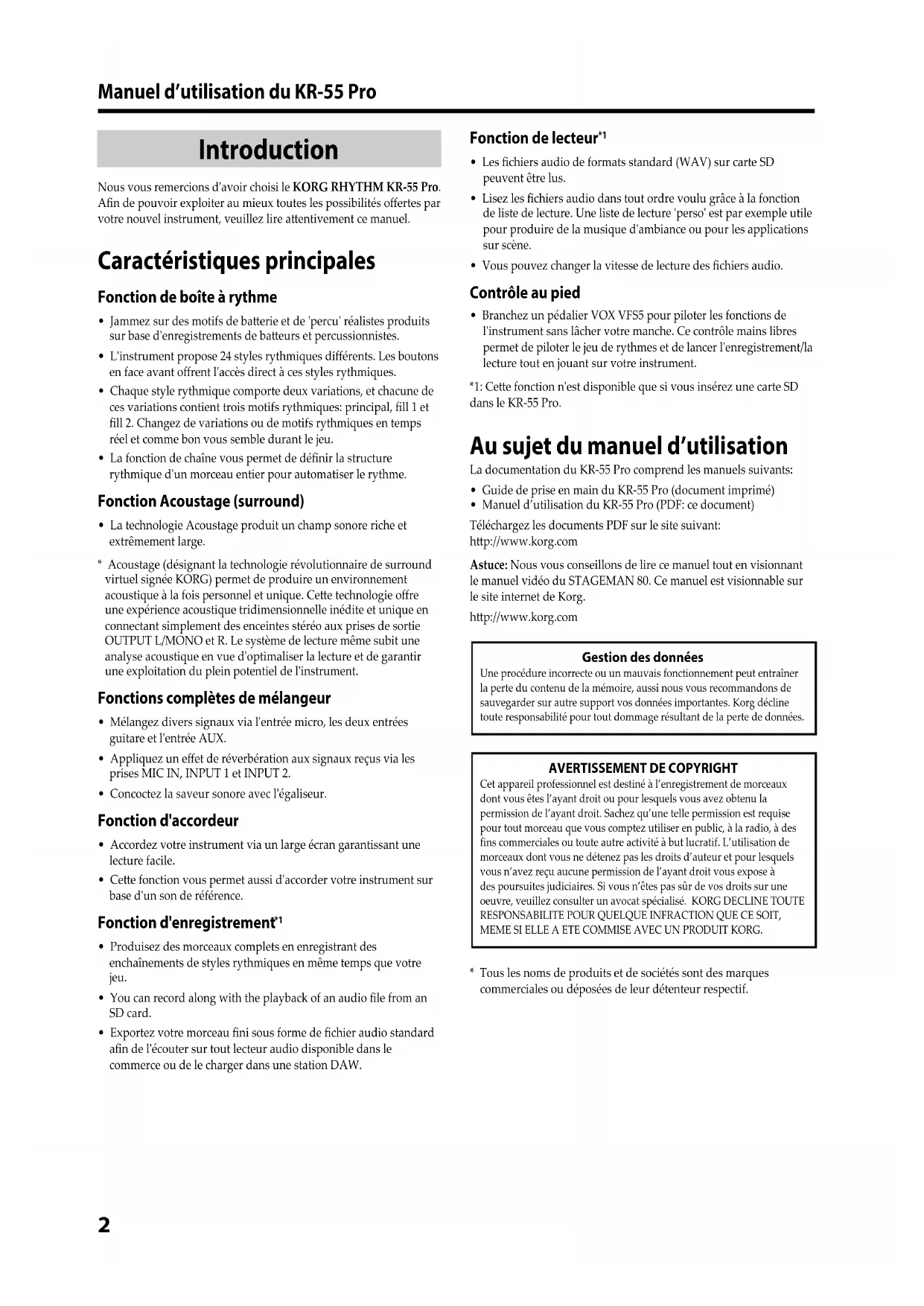 Nous vous remercions d'avoir choisi le KORG RHYTHM KR-55 Pro. Afin de pouvoir exploiter au mieux toutes les possibilités offertes par votre nouvel instrument, veuillez lire attentivement ce manuel.