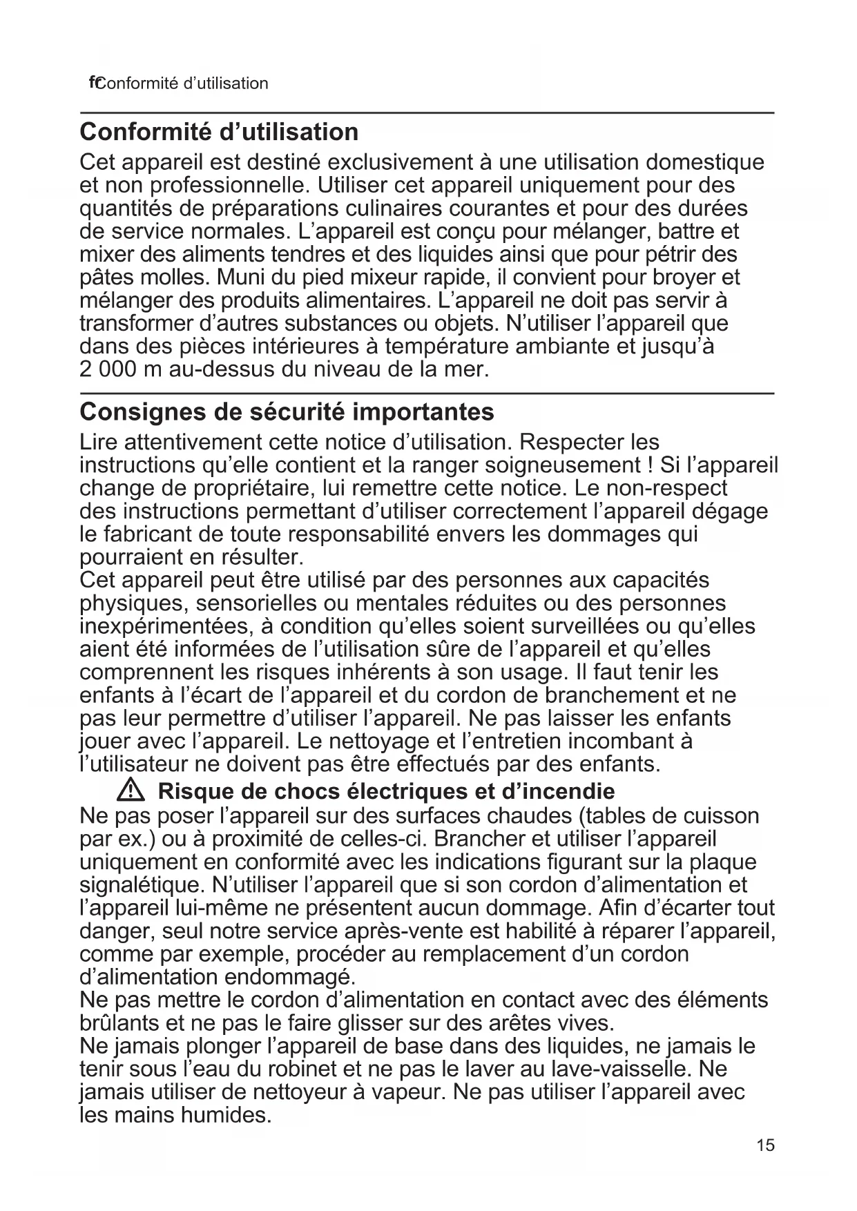 Conformité d’utilisation Conformité d’utilisation Cet appareil est destiné exclusivement à une utilisation domestique et non professionnelle. Utiliser cet appareil uniquement pour des quantités de préparations culinaires courantes et pour des durées de service normales. L’appareil est conçu pour mélanger, battre et mixer des aliments tendres et des liquides ainsi que pour pétrir des pâtes molles. Muni du pied mixeur rapide, il convient pour broyer et mélanger des produits alimentaires. L’appareil ne doit pas servir à transformer d’autres substances ou objets. N’utiliser l’appareil que dans des pièces intérieures à température ambiante et jusqu’à 2 000 m audessus du niveau de la mer. Consignes de sécurité importantes Lire attentivement cette notice d’utilisation. Respecter les instructions qu’elle contient et la ranger soigneusement ! Si l’appareil change de propriétaire, lui remettre cette notice. Le nonrespect des instructions permettant d’utiliser correctement l’appareil dégage le fabricant de toute responsabilité envers les dommages qui pourraient en résulter. Cet appareil peut être utilisé par des personnes aux capacités physiques, sensorielles ou mentales réduites ou des personnes inexpérimentées, à condition qu’elles soient surveillées ou qu’elles aient été informées de l’utilisation sûre de l’appareil et qu’elles comprennent les risques inhérents à son usage. Il faut tenir les enfants à l’écart de l’appareil et du cordon de branchement et ne pas leur permettre d’utiliser l’appareil. Ne pas laisser les enfants jouer avec l’appareil. Le nettoyage et l’entretien incombant à l’utilisateur ne doivent pas être effectués par des enfants. W Risque de chocs électriques et d’incendie Ne pas poser l’appareil sur des surfaces chaudes (tables de cuisson par ex.) ou à proximité de cellesci. Brancher et utiliser l’appareil uniquement en conformité avec les indications figurant sur la plaque signalétique. N’utiliser l’appareil que si son cordon d’alimentation et l’appareil luimême ne présentent aucun dommage. Afin d’écarter tout danger, seul notre service aprèsvente est habilité à réparer l’appareil, comme par exemple, procéder au remplacement d’un cordon d’alimentation endommagé. Ne pas mettre le cordon d’alimentation en contact avec des éléments brûlants et ne pas le faire glisser sur des arêtes vives. Ne jamais plonger l’appareil de base dans des liquides, ne jamais le tenir sous l’eau du robinet et ne pas le laver au lavevaisselle. Ne jamais utiliser de nettoyeur à vapeur. Ne pas utiliser l’appareil avec les mains humides.16 fr Consignes de sécurité importantes Ne pas plonger l’appareil dans un liquide audelà de la jonction entre l’appareil de base et l’accessoire mixeur rapide. L’appareil doit toujours être débranché du secteur, après chaque utilisation, lorsqu’il n’est pas sous surveillance, lorsqu’il doit être monté ou démonté, avant de le nettoyer et en cas de panne. W Risques de blessures! Ne jamais raccorder l’appareil à des minuteries ou à des prises pouvant être commandées à distance. Si une coupure de courant se produit, l’appareil reste en position allumée et redémarrera dès le retour du courant. Éteindre l’appareil immédiatement. Toujours surveiller l’appareil pendant son fonctionnement ! Ne jamais laisser l’appareil allumé plus longtemps que nécessaire au traitement des aliments. Une fois l’appareil utilisé, attendre l’arrêt de l’entraînement. L’appareil doit être éteint et débranché du secteur avant de procéder au changement d’accessoires ou de pièces complémentaires mobiles en fonctionnement. Ne monter et détacher les accessoires qu’une fois l’appareil immobilisé. Après son arrêt, l’appareil continue de tourner brièvement. Ne pas faire tourner l’appareil à vide. Ne pas toucher les pièces en rotation. Ne jamais approcher les doigts de la lame située dans le pied mixeur. Ne jamais nettoyer les lames avec les mains nues. Utiliser une brosse. Protéger les cheveux longs ou les vêtements flottants afin qu’ils ne se prennent pas dans les accessoires en rotation. Utiliser l’appareil avec les pièces et accessoires d’origine uniquement. Ne jamais utiliser les accessoires destinés à d’autres appareils. Utiliser uniquement des accessoires de même type par paire (p. ex. 2 x crochet pétrisseur). Ne jamais utiliser d’accessoires tandis que d’autres sont présents dans l’orifice arrière. W Risque de brûlure ! Attention lors du mixage d’aliments chauds. Les aliments chauds peuvent gicler pendant le mixage. W Important ! Avant d’utiliser le pied mixeur rapide dans la casserole, retirer préalablement cette dernière du foyer de cuisson. Le bol mixeur ne va pas au four microondes. Nettoyer l’appareil selon la description après chaque utilisation ou après une longue durée sans utilisation. X « Après le travail / Nettoyer » voir page 1917