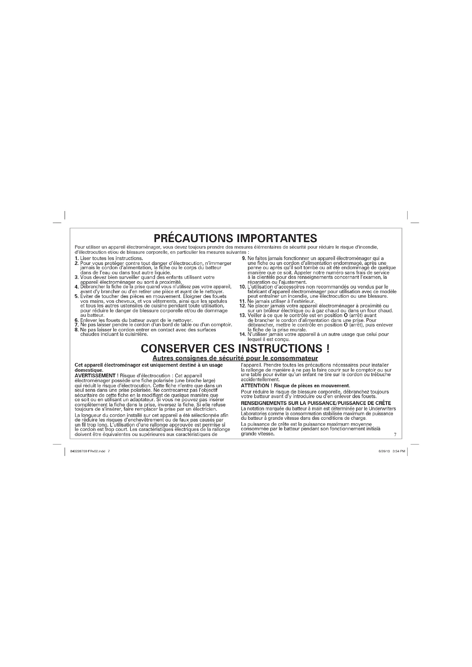 lequel il est conçu. Pour utiliser un appareil électroménager, vous devez toujours prendre des mesures élémentaires de sécurité pour réduire le risque d’incendie, d’électrocution et/ou de blessure corporelle, en particulier les mesures suivantes : CONSERVER CES INSTRUCTIONS ! Autres consignes de sécurité pour le consommateur Cet appareil électroménager est uniquement destiné à un usage domestique. AVERTISSEMENT ! Risque d’électrocution : Cet appareil électroménager possède une fiche polarisée (une broche large) qui réduit le risque d’électrocution. Cette fiche n’entre que dans un seul sens dans une prise polarisée. Ne contrecarrez pas l’objectif sécuritaire de cette fiche en la modifiant de quelque manière que ce soit ou en utilisant un adaptateur. Si vous ne pouvez pas insérer complètement la fiche dans la prise, inversez la fiche. Si elle refuse toujours de s’insérer, faire remplacer la prise par un électricien. La longueur du cordon installé sur cet appareil a été sélectionnée afin de réduire les risques d’enchevêtrement ou de faux pas causés par un fil trop long. L’utilisation d’une rallonge approuvée est permise si le cordon est trop court. Les caractéristiques électriques de la rallonge doivent être équivalentes ou supérieures aux caractéristiques de l’appareil. Prendre toutes les précautions nécessaires pour installer la rallonge de manière à ne pas la faire courir sur le comptoir ou sur une table pour éviter qu’un enfant ne tire sur le cordon ou trébuche accidentellement. ATTENTION ! Risque de pièces en mouvement. Pour réduire le risque de blessure corporelle, débranchez toujours votre batteur avant d’y introduire ou d’en enlever des fouets. RENSEIGNEMENTS SUR LA PUISSANCE/PUISSANCE DE CRÊTE La notation marquée du batteur à main est déterminée par le Underwriters Laboratories comme la consommation stabilisée maximum de puissance du batteur à grande vitesse dans des conditions de charge. La puissance de crête est la puissance maximum moyenne consommée par le batteur pendant son fonctionnement initialà grande vitesse. 840228700 FRv02.indd 7840228700 FRv02.indd 7 6/26/13 3:54 PM6/26/13 3:54 PM8 Pièces et caractéristiques Bowl Rest