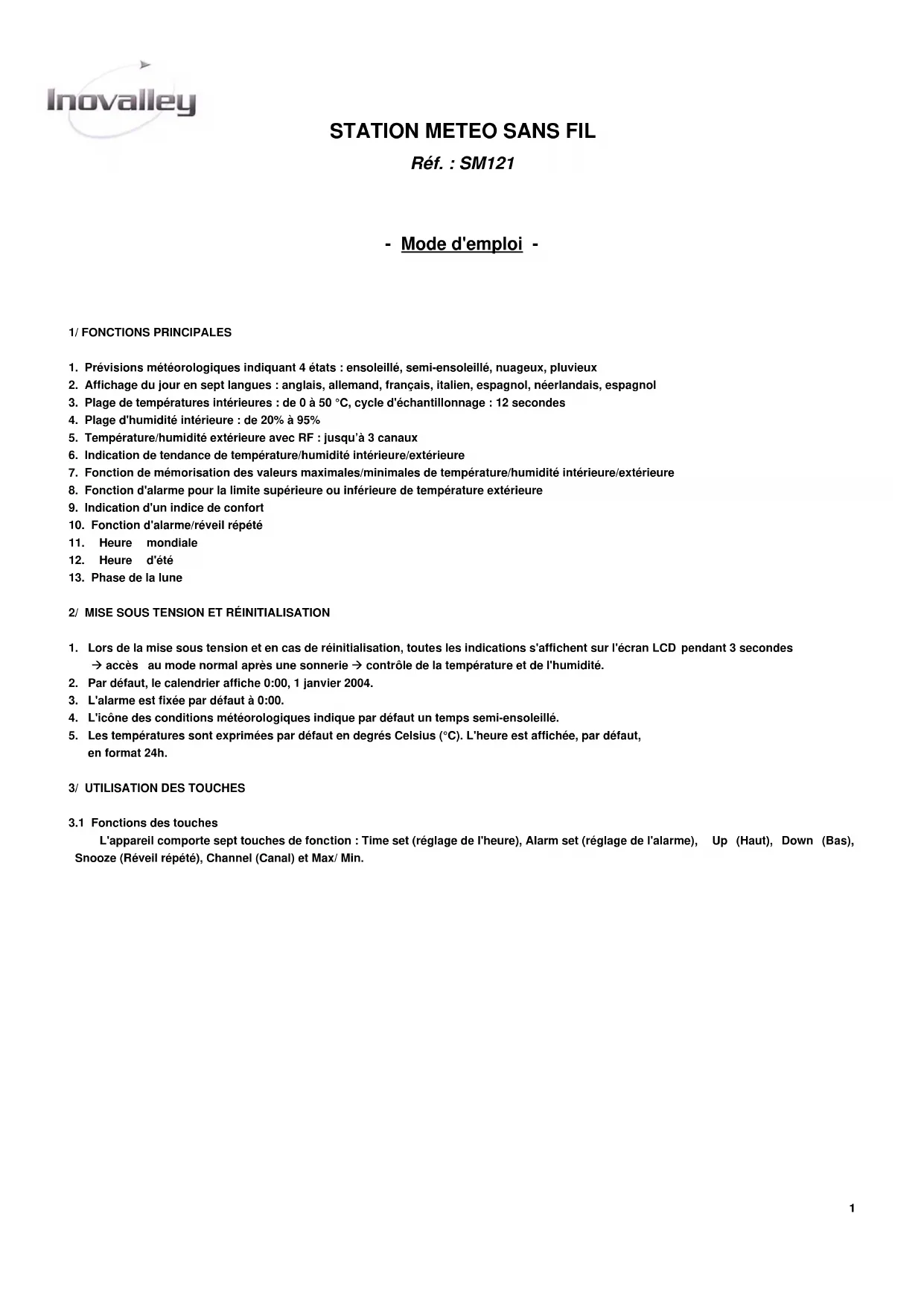 SM121 - Station Météo INOVALLEY - Notice d'utilisation et mode d'emploi gratuit