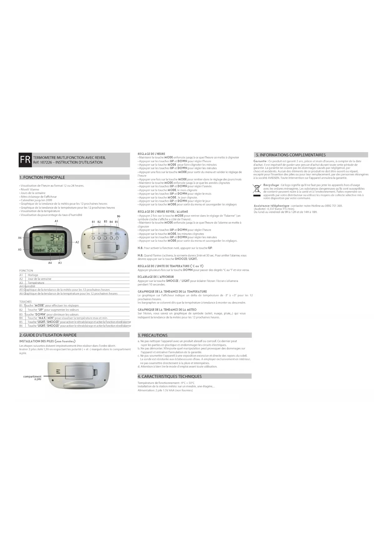 INSTALLATION DES PILES (non fournies) Les étapes suivantes doivent impérativement être réaliser dans l'ordre décrit. Insérer 2 piles AAA 1,5V en respectant les polarité ( + et -) marqués dans le compartiment à pile. FONCTION A2 Jour de la semaine A1 Horloge A3 Température A4 Humidité TOUCHES B1 Touche “MODE” pour eectuer les réglages B2 Touche “UP” pour augmenter les valeurs B3 Touche “DOWN” pour diminuer les valeurs B4 Touche “MAX/MIN” pour visualiser la température max et min. B5 Touche “LIGHT/SNOOZE” pour activer le rétroéclairage et actier la fonction réveil/alarme