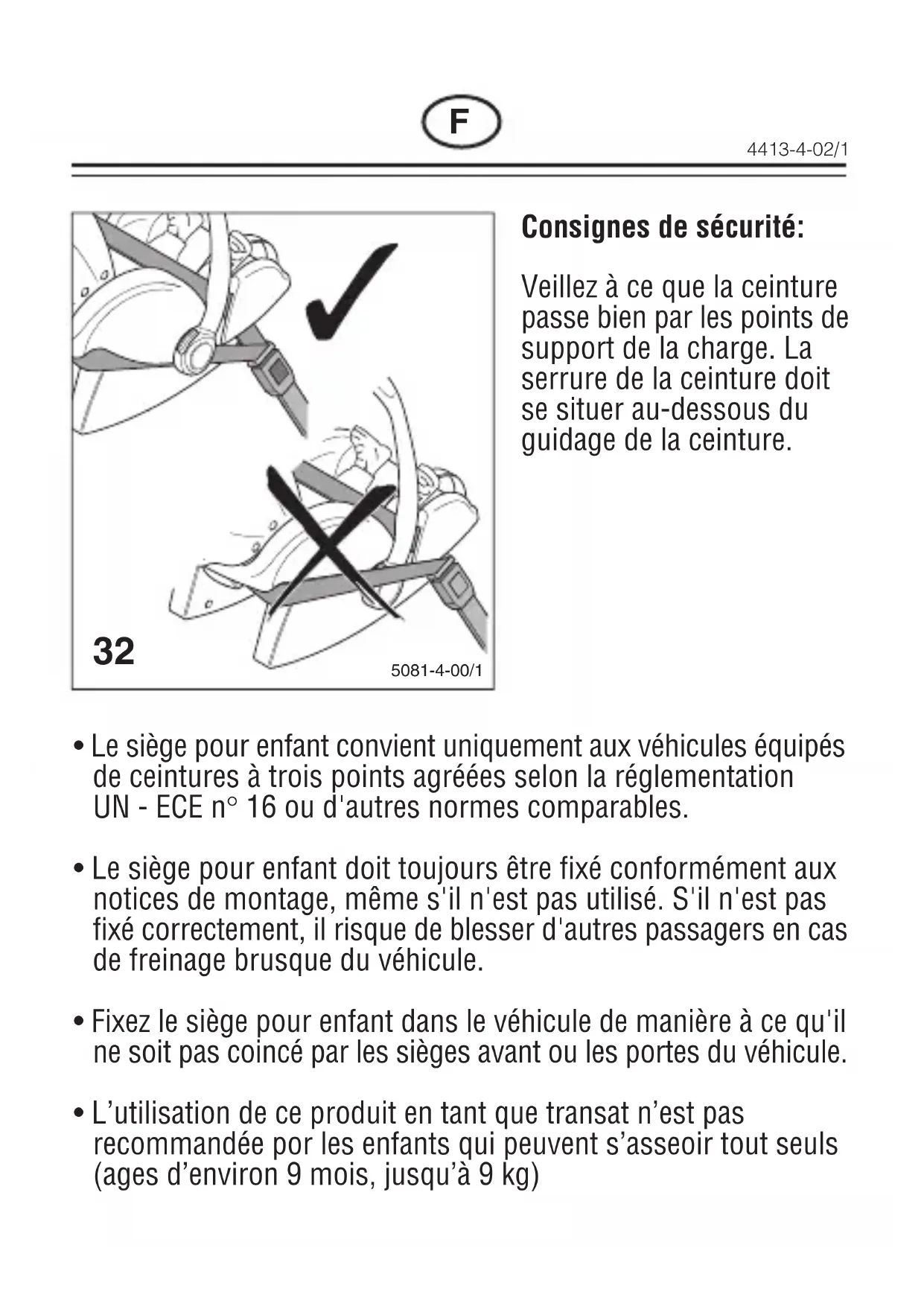 - Le siège pour infant convient uniquement aux vehicules équipés de ceintures à trois points agréées selon la règlementation UN - ECE n° 16 ou d'autres normes comparables.