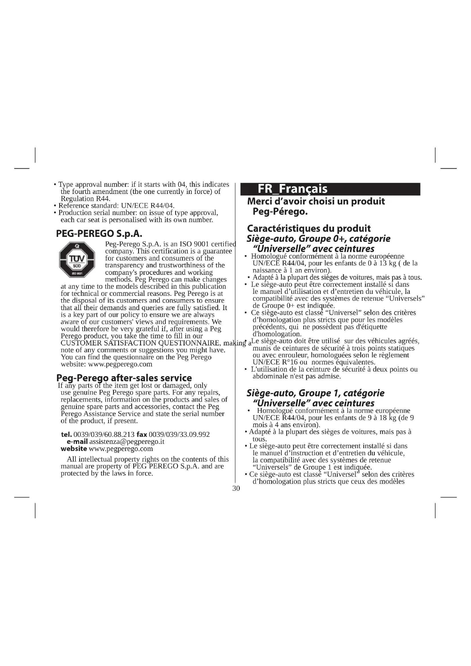 - Numéro progressif de fabrication : il est propre à chaque siège-auto ; lorsque l’homologation est délivrée, chaque produit est caractérisé par un numéro différent. PEG-PÉREGO S.p.A. La certification offre à la clientèle une garantie de transparence et représente un gage de confiance dans la façon de travailler de l’entreprise. Peg-Pérego se réserve le droit de procéder à tout moment à des modifications sur les modèles décrits dans cet ouvrage, pour des raisons de nature technique ou commerciale. Peg-Pérego est à la disposition de sa clientèle pour satisfaire au mieux chacune de ses exigences. En cela, il est très important et précieux pour nous de connaître l’opinion de notre clientèle. Nous vous saurions donc gré, après avoir utilisé un de nos produits, de remplir le QUESTIONNAIRE DE SATISFACTION CLIENT, en nous faisant part de toute observation ou suggestion éventuelle. Vous trouverez ce questionnaire sur notre site Internet, à l'adresse www.pegperego.com Service d’assistance Peg-Pérego En cas de perte de pièces ou de rupture de l’une d’elles, utiliser exclusivement des pièces de rechange originales Peg-Pérego. Pour toute réparation, remplacement, informations sur les produits, vente de pièces détachées d’origine et accessoires, contacter le service après-vente Peg Pérego en indiquant, si présent, le numéro de série du produit. tél. 0039/039/60.88.213 fax 0039/039/33.09.992 e-mail assistenza@pegperego.it site Internet www.pegperego.com Tous les droits de propriété intellectuelle relatifs au contenu de ce manuel appartiennent à PEG PEREGO SpA et sont protégés par la loi.36 auf der Grundlage strengerer Zulassungskriterien als bei den Vorgängermodellen, die nicht über diese Zulassung verfügen. WICHTIG