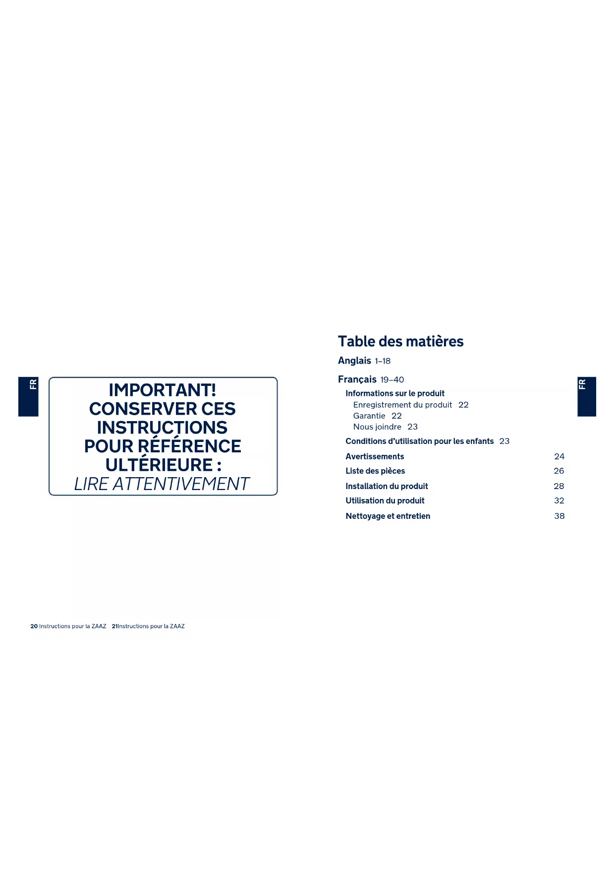 20 Instructions pour la ZAAZ 21Instructions pour la ZAAZ Table des matières Anglais 1–18 Français 19–40 Informations sur le produit Enregistrement du produit 22 Garantie 22 Nous joindre 23 Conditions d’utilisation pour les enfants 23 Avertissements 24 Liste des pièces 26 Installation du produit 28 Utilisation du produit 32 Nettoyage et entretien 38FR