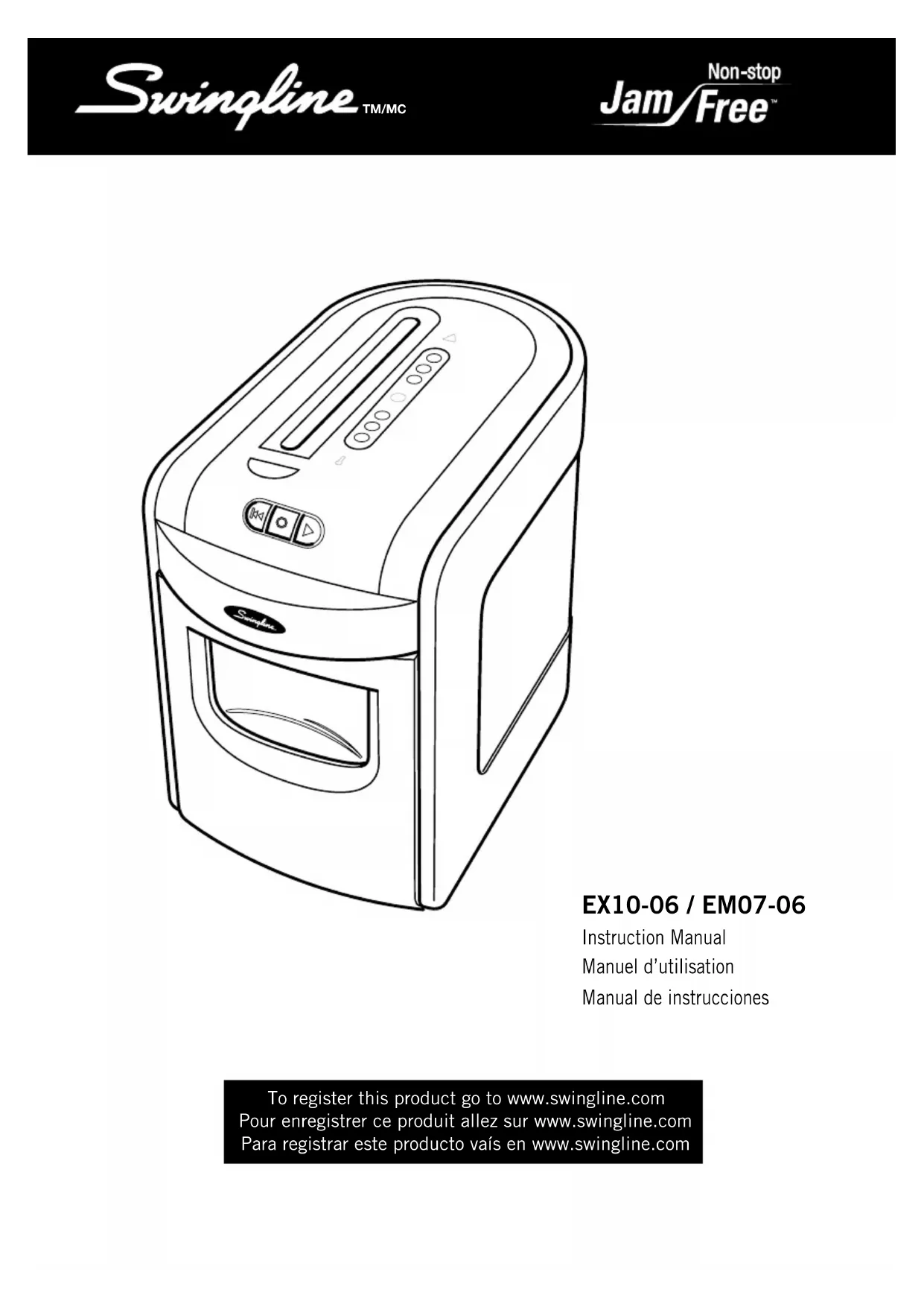 QUE LA EXCLUSIÓN O LIMITACIÓN PRECEDENTE PUEDE NO SER APLICABLE A SU CASO. PARA LOS CONSUMIDORES QUE CUENTAN CON EL BEN- EFICIO DE LEYES O REGULACIONES DE PROTECCIÓN AL CONSUMIDOR EN LA JURISDICCIÓN DONDE SE EFECTUÓ LA COMPRA O SI LAS LEYES SON DIFERENTES Y APLICAN A LA JURISDICCIÓN DE RESIDENCIA, LOS BENEFICIOS OTORGADOS POR ESTA GARANTÍA SON ADICIONALES A TODOS LOS DEMÁS DERECHOS Y COMPENSACIONES QUE MARCAN TALES LEYES Y REGULACIONES DE PROTECCIÓN AL CONSUMIDOR. Conforme a lo permitido por ley, esta garantía no es transfer- ible y se extingue automáticamente si el comprador original del producto vende o se deshace de dicho producto de cualquier otra manera. Esta garantía le proporciona derechos específicos otorgados por las leyes. Pueden existir otros derechos, que varían según la jurisdicción. Además, ciertas jurisdicciones no permiten (i) la exclusión de ciertas garantías, (ii) las limitaciones de la duración de las garantías implícitas o (iii) la exclusión o lim- itación de ciertos tipos de costos o daños y perjuicios de modo que las limitaciones precedentes pueden no ser aplicables. Garantie limitée de 5 ans pour les lames de la déchiqueteuse Swingline™ EX10-06, Garantie limitée de 1 an pour les lames de la déchi- queteuse Swingline™ EM07-06, et Garantie limitée de 2 ans pour toutes les autres pièces des déchiqueteuses EX10-06 et EM07-06 ACCO Brands USA LLC, 300 Tower Parkway, Lincolnshire, IL 60069 (au Canada, ACCO Brands Canada Inc., 5 Precidio Court, Brampton, ON L6S-6B7; et au Mexique, ACCO Mexi- cana, S.A. de C.V. Av. Circuito Industrial Norte #6 Parque Industria Lerma 52000, Lerma Edo. De México) (Chaque « ACCO Brands » respectif) garantit à l’acheteur initial que : POUR LA : Déchiqueteuse Swingline™ EX10-06 Les lames de cette déchiqueteuse Swingline™ EX10-06 sont exemptes de défauts de fabrication et de main-d’œuvre dans des conditions d’utilisation et d’entretien normales pour une période de 5 ans à partir de la date d’achat, et toutes les autres pièces sont exemptes de défauts de fabrication et de main-d’œuvre dans des conditions d’utilisation et d’entretien normales pour une période de 2 ans à partir de la date d’achat. POUR LA : Déchiqueteuse Swingline™ EM07-06 Les lames de cette déchiqueteuse Swingline™ EM07-06 sont exemptes de défauts de fabrication et de main-d’œuvre dans des conditions d’utilisation et d’entretien normales pour une période de 1 an à partir de la date d’achat, et toutes les autres pièces sont exemptes de défauts de fabrication et de main-d’œuvre dans des conditions d’utilisation et d’entretien normales pour une période de 2 ans à partir de la date d’achat. L’obligation d’ACCO Brands envers cette garantie est limitée au remplacement ou à la réparation, au choix d’ACCO Brands, dans le cas où, n’importe quelle pièce garantie serait trouvée défectueuse par ACCO Brands et ce, sans frais de matériel ou de main-d’œuvre. ACCO Brands se réserve le droit de remplacer le produit défectueux par un autre produit identique ou par son équivalent qui peut contenir des pièces réusinées ou remises à neuf. La garantie sera nulle et non avenue dans les circonstances suivantes : (i) si le produit a été utilisé abusivement, (ii) si le produit a été endommagé par négligence ou ac- cidentellement ou, (iii) si le produit a été modifié par une personne autre qu’un employé ou un agent autorisé d’ACCO Brands. Pour prestation de la garantie, veuillez composer : 1-800-541-0094 aux É.-U. 1-800-263-1063 au Canada 1-800-758-6825 au Mexique Ou visitez le site www.swingline.com. DANS LA MESURE AUTORISÉE PAR LA LOI APPLICABLE, LA PRÉSENTE GARANTIE REMPLACE TOUTES LES AUTRES