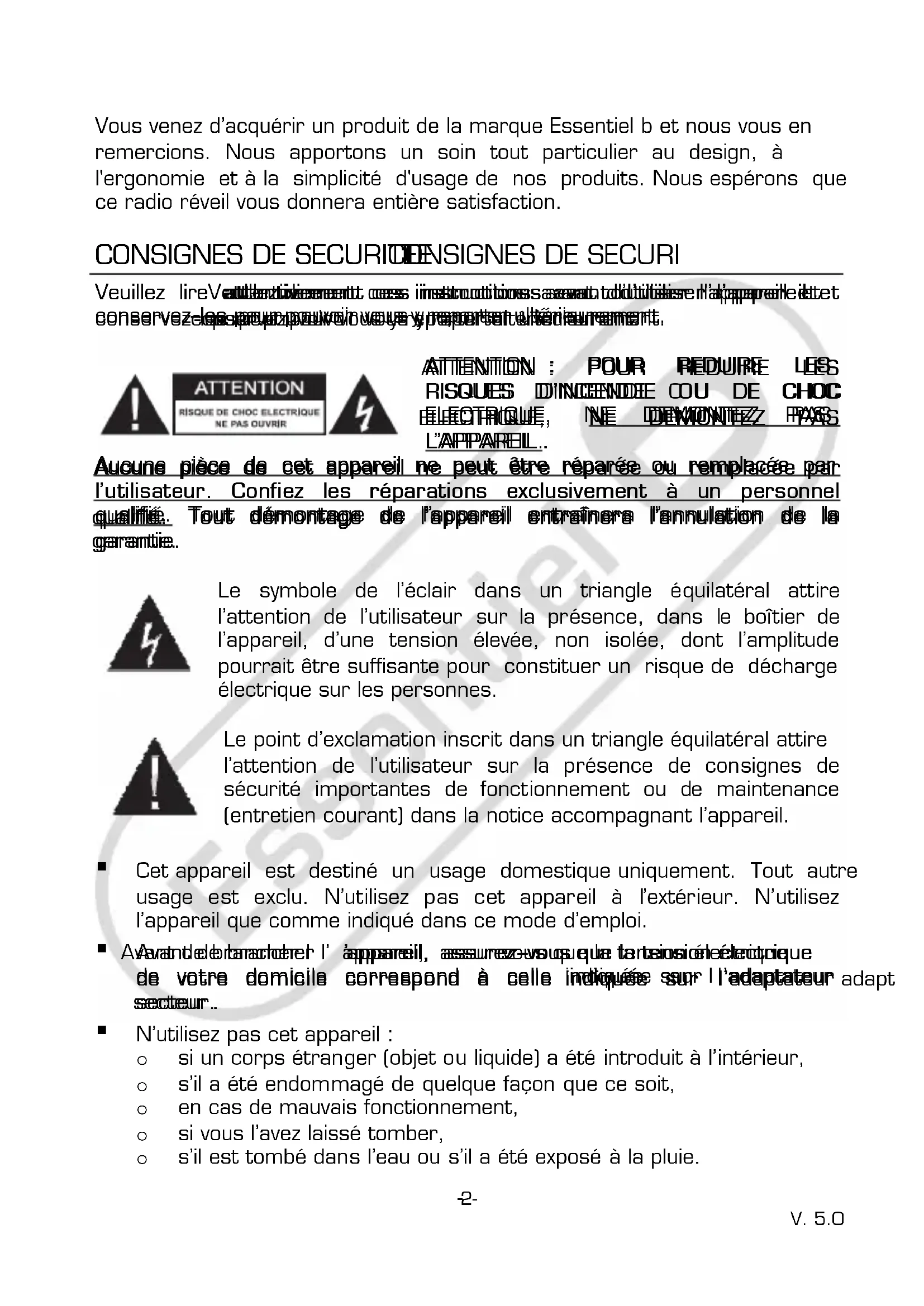 Vous venez d'acquerir un produit de la marque Essentiel b et nous vous en remercions. Nous apportons unsoon tout particulier au design, à l'ergonomie et à la simplicité d'utilité des nos produits. Nous espérons que ce radio réveil vous donna sera entière satisfaction.