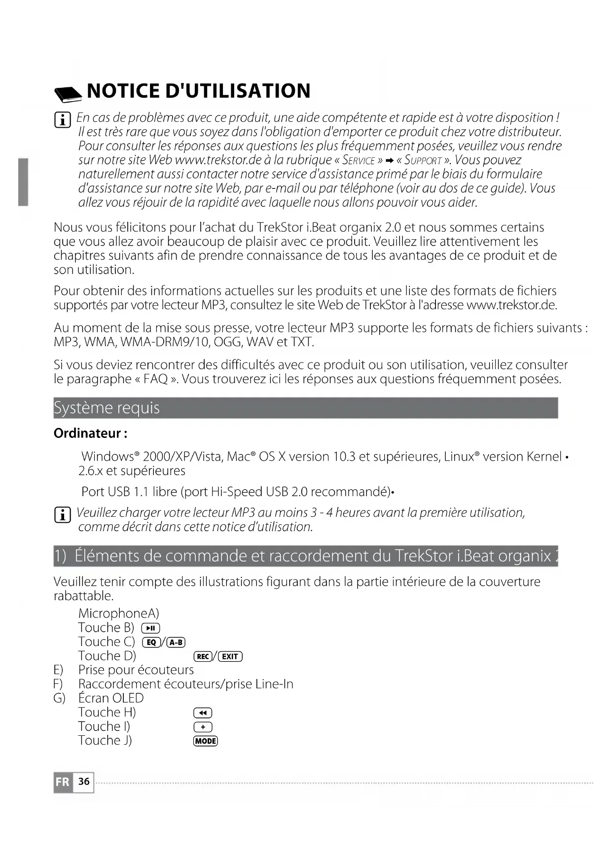 En cas de problèmes avec ce produit, une aide compétente et rapide est à votre disposition ! Il est très rare que vous soyez dans l'obligation d'emporter ce produit chez votre distributeur. Pour consulter les réponses aux questions les plus fréquemment posées, veuillez vous rendre sur notre site Web www.trekstor.de à la rubrique « Se r v i c e » + « Su p p o r t ». Vous pouvez naturellement aussi contacter notre service d'assistance primé par le biais du formulaire d'assistance sur notre site Web, par e-mail ou par téléphone (voir au dos de ce guide). Vous allez vous réjouir de la rapidité avec laquelle nous allons pouvoir vous aider. Nous vous félicitons pour l’achat du TrekStor i.Beat organix 2.0 et nous sommes certains que vous allez avoir beaucoup de plaisir avec ce produit. Veuillez lire attentivement les chapitres suivants afin de prendre connaissance de tous les avantages de ce produit et de son utilisation. Pour obtenir des informations actuelles sur les produits et une liste des formats de fichiers supportés par votre lecteur MP3, consultez le site Web de TrekStor à l'adresse www.trekstor.de. Au moment de la mise sous presse, votre lecteur MP3 supporte les formats de fichiers suivants : MP3, WMA, WMA-DRM9/10, OGG, WAV et TXT. Si vous deviez rencontrer des difficultés avec ce produit ou son utilisation, veuillez consulter le paragraphe « FAQ ». Vous trouverez ici les réponses aux questions fréquemment posées. Système requis Ordinateur : Windows® 2000/XP/Vista, Mac® OS X version 10.3 et supérieures, Linux® version Kernel •