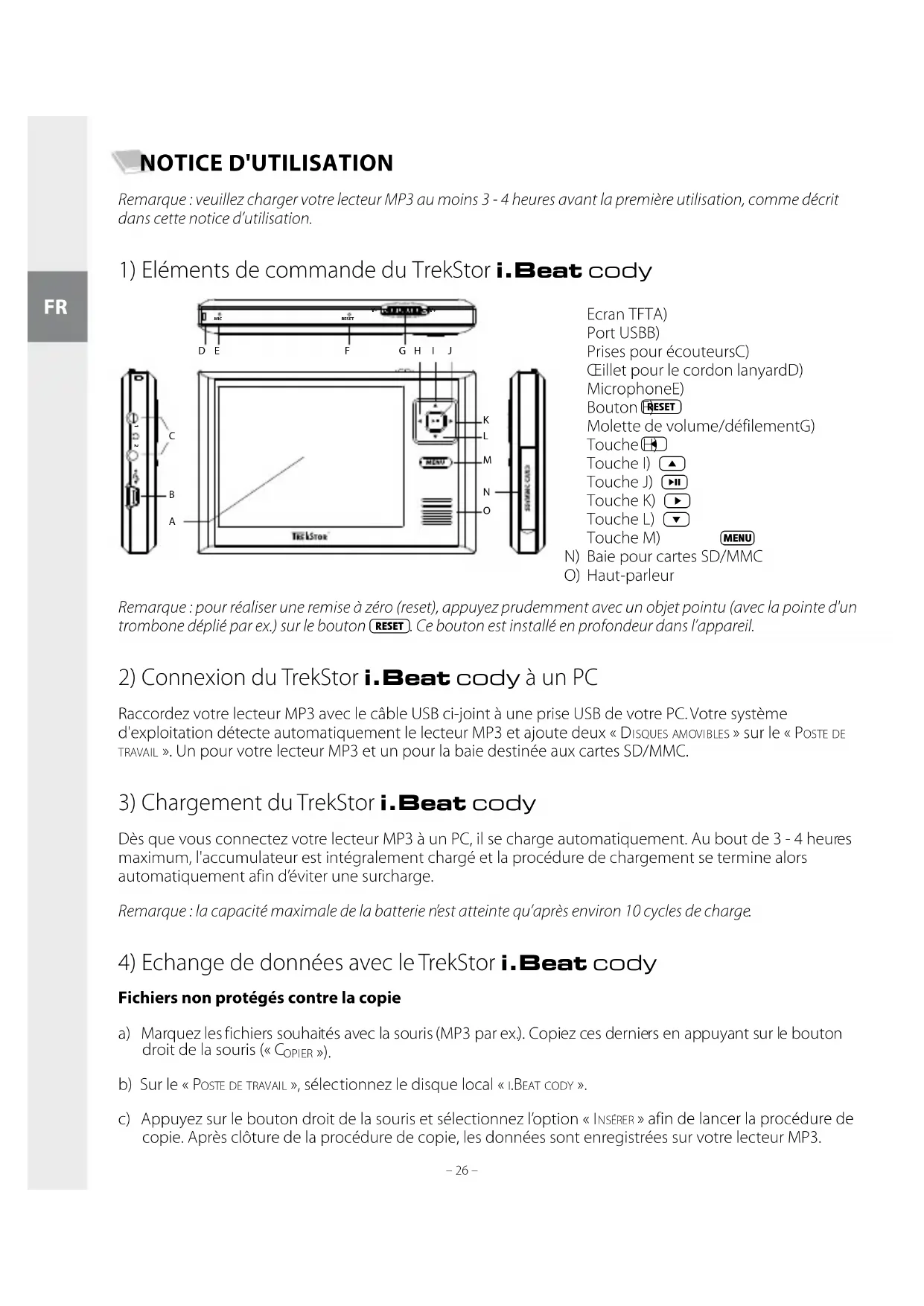 – 27 – NOTICE D'UTILISATION Remarque : veuillez charger votre lecteur MP3 au moins 3 - 4 heures avant la première utilisation, comme décrit dans cette notice d’utilisation.