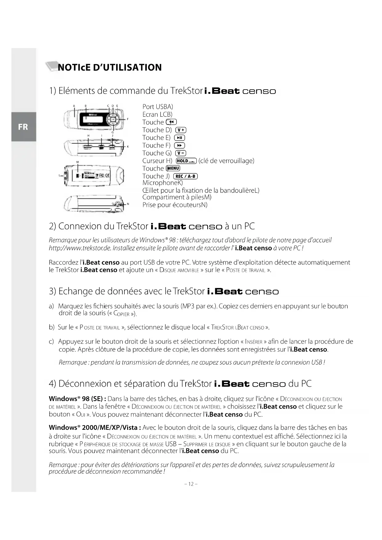 Windows® 98 (SE) : Dans la barre des tâches, en bas à droite, cliquez sur l'icône « dé c o n n e x i o n o U é J e c t i o n d e M A t é r i e l ». Dans la fenêtre « dé c o n n e x i o n o U é J e c t i o n d e M A t é r i e l » choisissez l'i.Beat censo et cliquez sur le bouton « o U i ». Vous pouvez maintenant déconnecter l'i.Beat censo du PC. Windows® 2000/ME/XP/Vista : Avec le bouton droit de la souris, cliquez dans la barre des tâches en bas à droite sur l'icône « d é c o n n e x i o n o U é J e c t i o n d e M A t é r i e l ». Un menu contextuel est affiché. Sélectionnez ici la rubrique « p é r i p h é r i q U e d e s t o c K A g e d e M A s s e Usb – sU p p r i M e r l e d i s q U e » en cliquant sur le bouton gauche de la souris. Vous pouvez maintenant déconnecter l'i.Beat censo du PC. Remarque : pour éviter des détériorations sur l’appareil et des pertes de données, suivez scrupuleusement la procédure de déconnexion recommandée !
