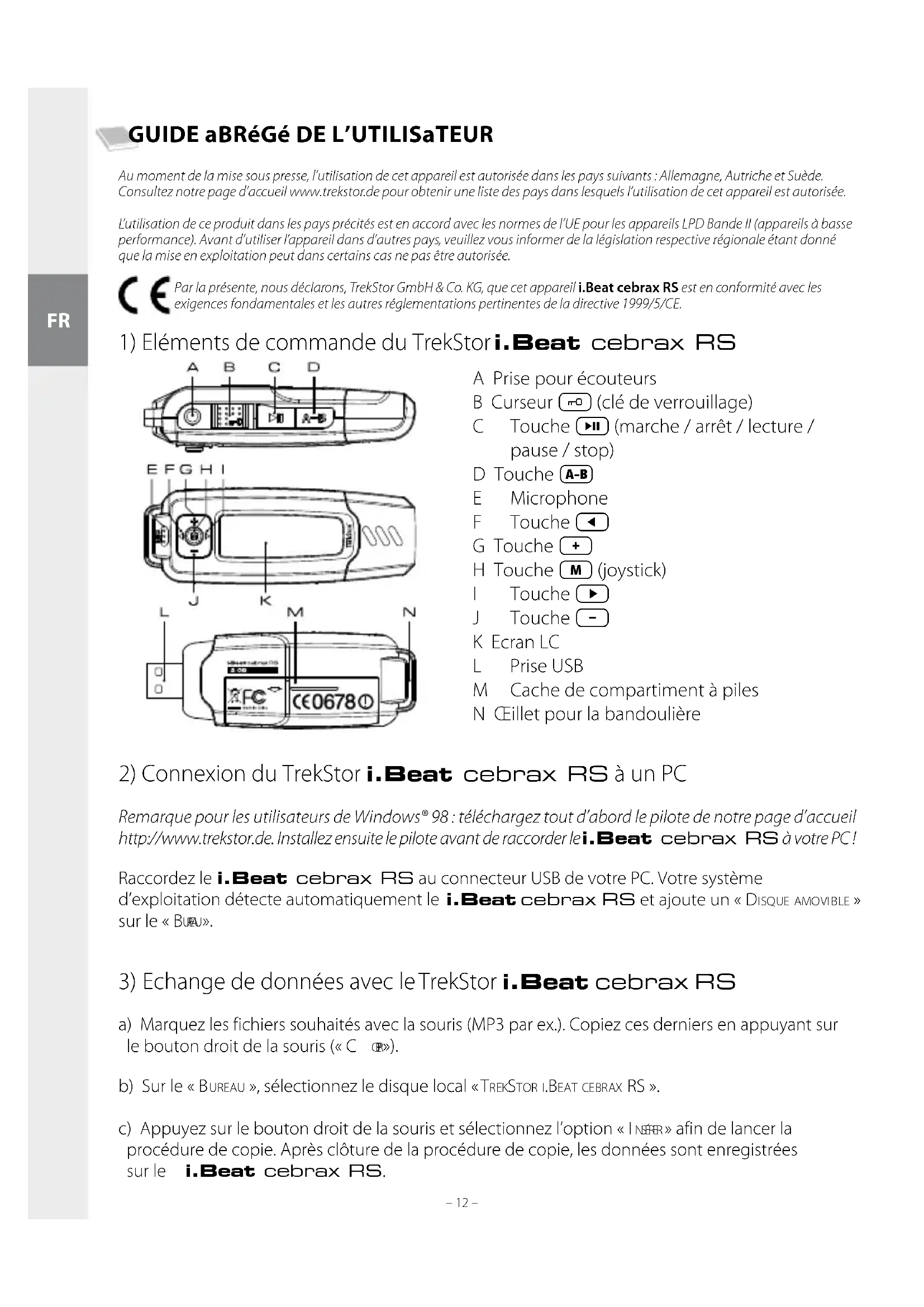 - DonotuseUSBcableslongerthan3meters. The manufacturer retains the right to continuously improve the product. These changes may be made without being directly described in these quick guides. For this reason, the information provided in these quick guides may not reflect the current state of the art. The manufacturer only guarantees suitability for the product’s intended purpose. In addition, the manufacturer is not responsible for damages or loss of data and subsequent consequences. Copyright © 2007 TrekStor GmbH & Co. KG. All rights retained. Other cited product or company names may be trademarks or brand names of the respective owner.– 12 – – 13 – GUIDE abRéGé DE L’UTILISaTEUR Au moment de la mise sous presse, l’utilisation de cet appareil est autorisée dans les pays suivants : Allemagne, Autriche et Suède. Consultez notre page d’accueil www.trekstor.de pour obtenir une liste des pays dans lesquels l’utilisation de cet appareil est autorisée. L’utilisation de ce produit dans les pays précités est en accord avec les normes de l’UE pour les appareils LPD Bande II (appareils à basse performance). Avant d’utiliser l’appareil dans d’autres pays, veuillez vous informer de la législation respective régionale étant donné que la mise en exploitation peut dans certains cas ne pas être autorisée. Par la présente, nous déclarons, TrekStor GmbH & Co. KG, que cet appareil i.Beat cebrax RS est en conformité avec les exigences fondamentales et les autres réglementations pertinentes de la directive 1999/5/CE.