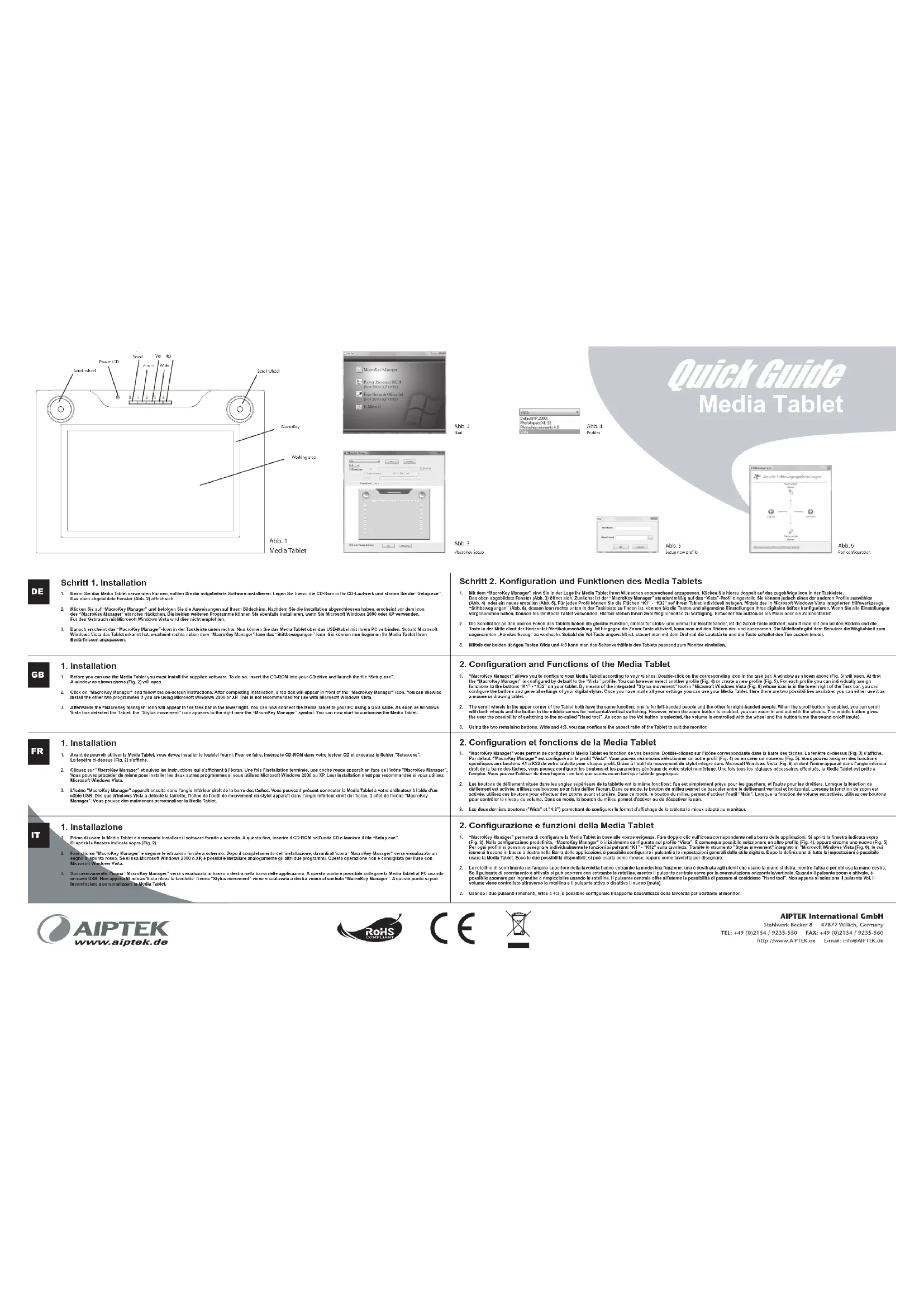 1. Avant de pouvoir utiliser la Media Tablet, vous devez installer le logiciel fourni. Pour ce faire, insérez le CD-ROM dans votre lecteur CD et exécutez le fichier "Setup.exe". La fenêtre ci-dessus (Fig. 2) s'affiche. 2. Cliquez sur "MacroKey Manager" et suivez les instructions qui s'affichent à l'écran. Une fois l'installation terminée, une coche rouge apparaît en face de l'icône "MacroKey Manager". Vous pouvez procéder de même pour installer les deux autres programmes si vous utilisez Microsoft Windows 2000 ou XP. Leur installation n'est pas recommandée si vous utilisez Microsoft Windows Vista. 3. L'icône "MacroKey Manager" apparaît ensuite dans l'angle inférieur droit de la barre des tâches. Vous pouvez à présent connecter la Media Tablet à votre ordinateur à l'aide d'un câble USB. Dès que Windows Vista a détecté la tablette, l'icône de l'outil de mouvement du stylet apparaît dans l'angle inférieur droit de l'écran, à côté de l'icône "MacroKey Manager". Vous pouvez dès maintenant personnaliser la Media Tablet.