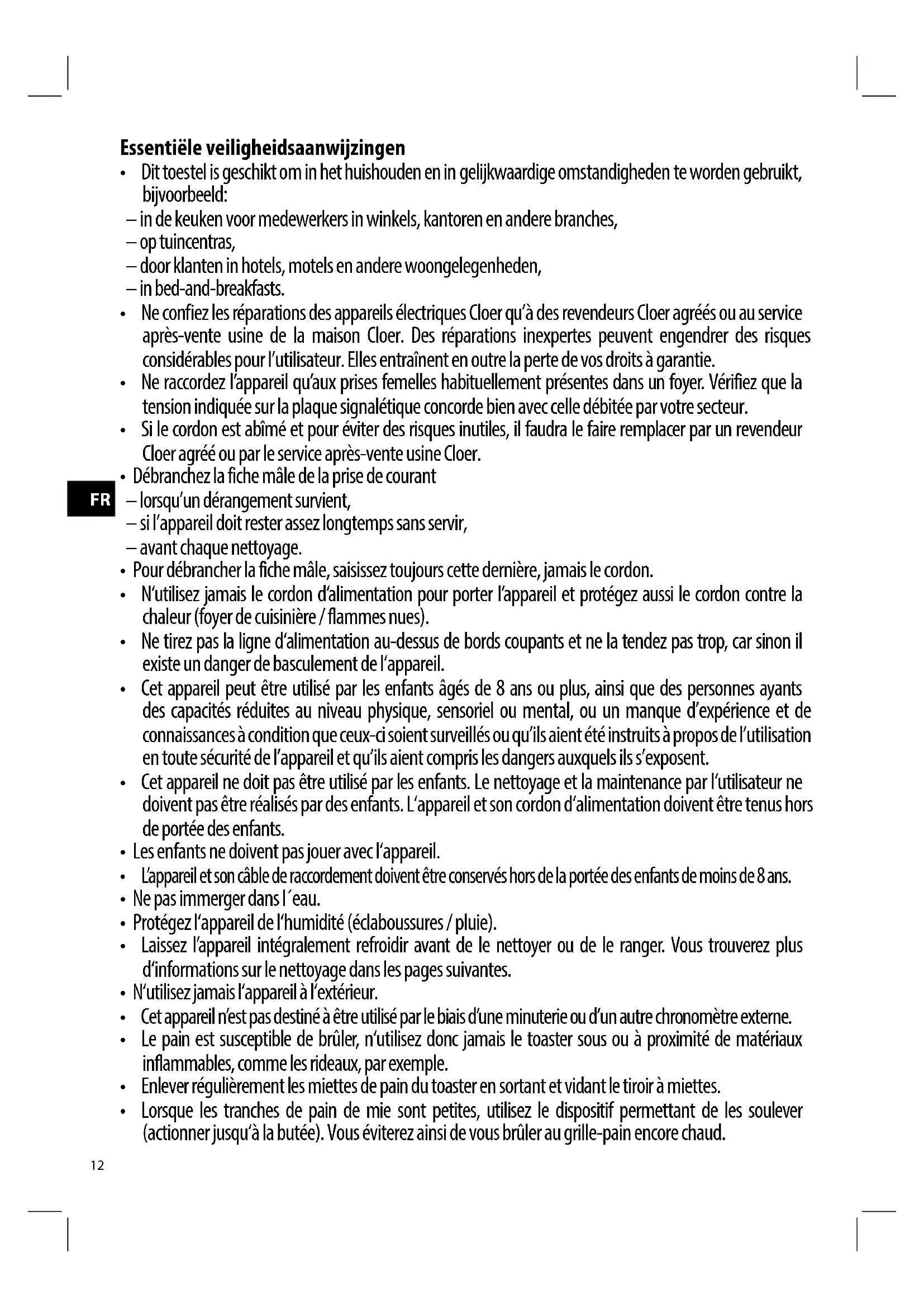 Les apparêils électriques correspondant aux directives actuelles et aux prescriptions en matière de sécurité de l'UE. Si vous appareil Cloer présente un dysfonctionnement, ou qu'il ne fonctionne pas correctement, veillez consulterer votre distributeur/agree ou le service après-vente d'usine de Cloer.