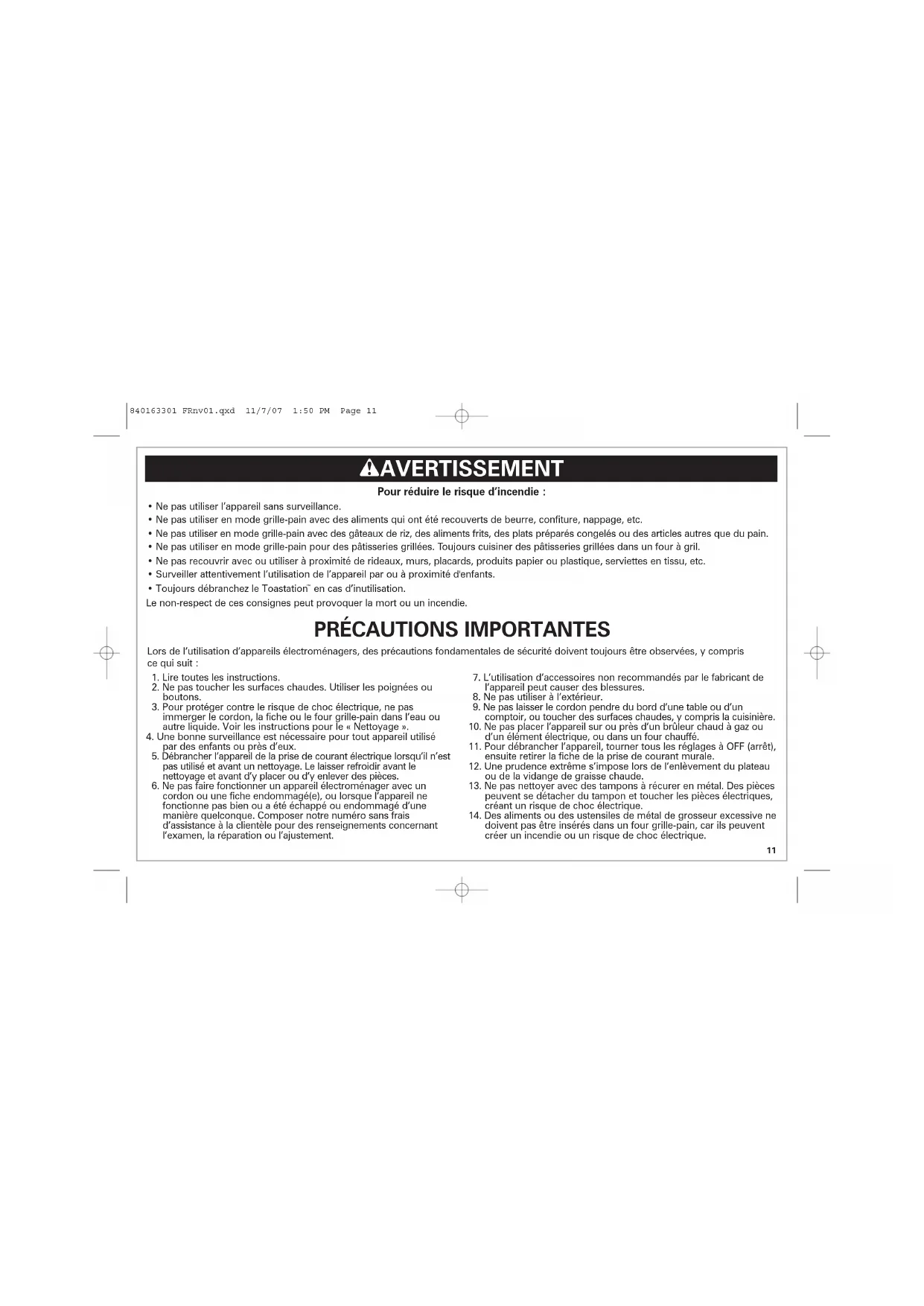- Des alimentes ou des ustensiles de métal de grosseur excessive ne doivent pas été insérés dans un four grille-pain, car ils peuvent creer un incendie ou un risque de choc électrique.