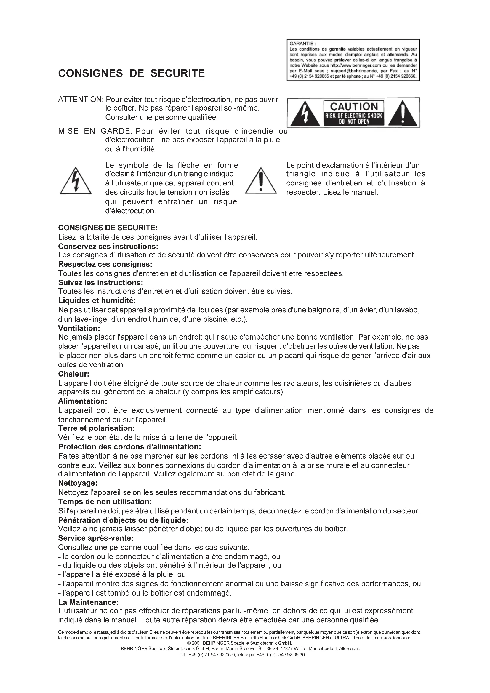 GARANTIE: Les conditions de garantie valables actuellément en vigueur sont reprises aux modes d'emploi anglais et allemands. Au besoin, vous pouvez prélever celles-ci en langue française à notre Website sous http://www.behringer.com ou les demander par E-Mail sous; support@behringer.de, par Fax; au N° +49 (0) 2154 920665 et par téléphone; au N° +49 (0) 2154 920666.
