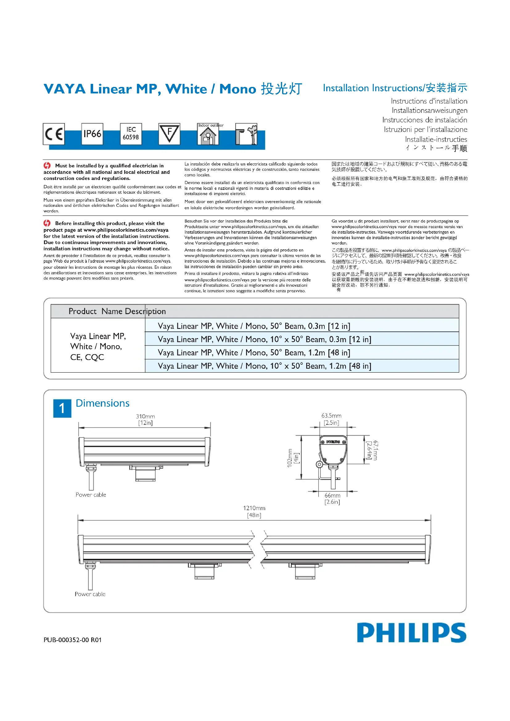 ᅝ㺙䆹ѻકПࠡˈ䇋ܜ䆓䯂ѻક义䴶www.philipscolorkinetics.com/vaya ҹ㦋প᳔ᮄ⠜ⱘᅝ㺙䇈ᯢDŽ⬅Ѣϡᮁഄᬍ䖯߯ᮄˈᅝ㺙䇈ᯢৃ 㛑Ӯ᳝᠔ᬍࡼˈᘩϡ㸠䗮ⶹDŽ Before installing this product, please visit the product page at www.philipscolorkinetics.com/vaya for the latest version of the installation instructions. Due to continuous improvements and innovations, installation instructions may change without notice. Avant de procéder à l’installation de ce produit, veuillez consulter la page Web du produit à l’adresse www.philipscolorkinetics.com/vaya pour obtenir les instructions de montage les plus récentes. En raison des améliorations et innovations sans cesse entreprises, les instructions de montage peuvent être modifiées sans préavis. [12in] 310mm Power cable [48in] 1210mm Power cable IEC