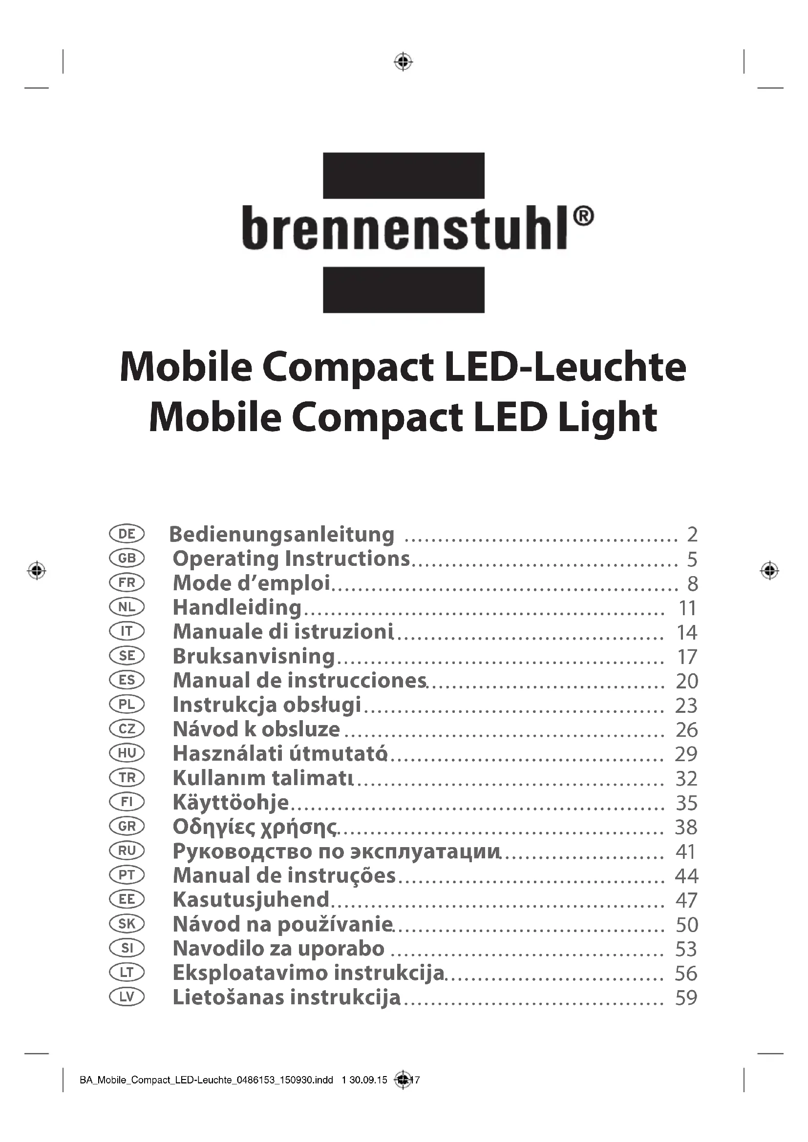 Mode d’emploi Lampe LED compacte mobile MAINTENANCE : ATTENTION : La lampe LED ne contient aucun composant nécessitant une maintenance. La source lumineuse LED ne peut pas être remplacée. Si besoin est, la lampe tout entière doit être remplacée. Ne jamais ouvrir la lampe. Danger de mort par électrocution ! Pour de plus amples informations, nous vous recommandons de consulter le domaine Service/FAQ sur notre site Internet : www.brennenstuhl.com. NETTOYAGE : Ne pas utiliser des solvants, détergents corrosifs ou produits similaires. N’utilisez qu’un chion sec ou légèrement humide. ELIMINATION DES DÉCHETS : Jetez les appareils électriques conformément aux impératifs écologiques ! Ne jetez pas les appareils électriques dans les ordures ménagères ! Selon la directive européenne 2012/19/EU sur les appareils électriques et électroniques, les appareils électriques usés doivent être collectés séparément et sont destinés à un recyclage respectueux de l’environnement. Vous obtiendrez des informations sur les possibilités d’élimination de l’appareil usé auprès de l’administration de votre commune ou municipalité. BA_Mobile_Compact_LED-Leuchte_0486153_150930.indd 10 30.09.15 17:1711
