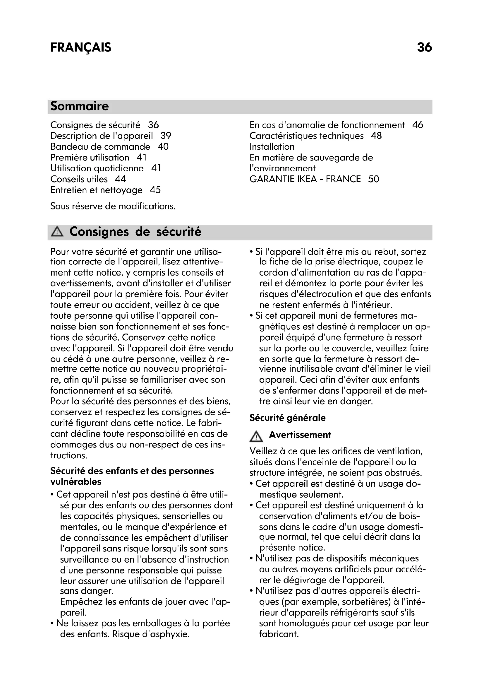 Sous réserve de modifications. Consignes de sécurité Pour votre sécurité et garantir une utilisa- tion correcte de l'appareil, lisez attentive- ment cette notice, y compris les conseils et avertissements, avant d'installer et d'utiliser l'appareil pour la première fois. Pour éviter toute erreur ou accident, veillez à ce que toute personne qui utilise l'appareil con- naisse bien son fonctionnement et ses fonc- tions de sécurité. Conservez cette notice avec l'appareil. Si l'appareil doit être vendu ou cédé à une autre personne, veillez à re- mettre cette notice au nouveau propriétai- re, afin qu'il puisse se familiariser avec son fonctionnement et sa sécurité. Pour la sécurité des personnes et des biens, conservez et respectez les consignes de sé- curité figurant dans cette notice. Le fabri- cant décline toute responsabilité en cas de dommages dus au non-respect de ces ins- tructions. Sécurité des enfants et des personnes vulnérables