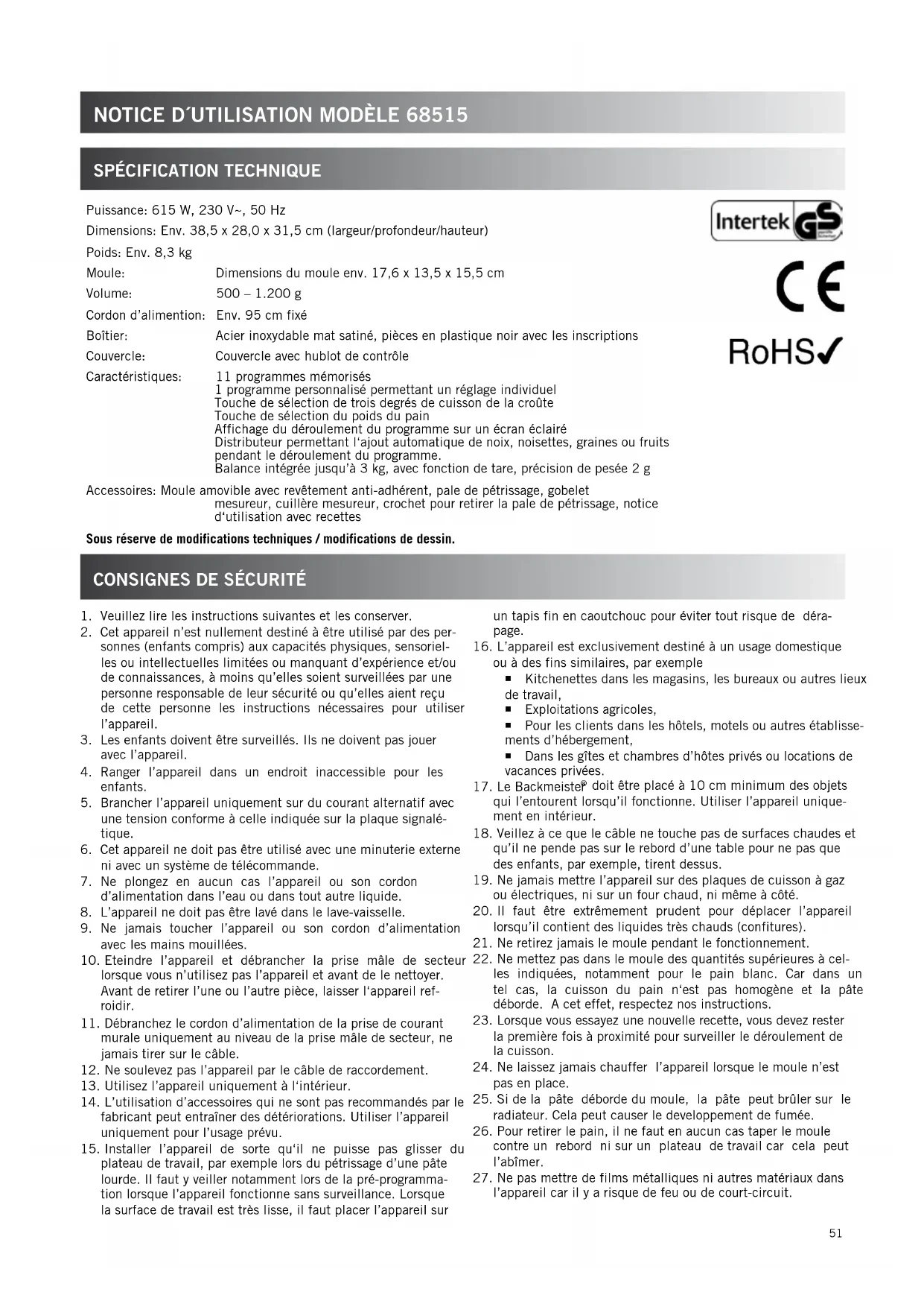 l’appareil car il y a risque de feu ou de court-circuit. Puissance: 615 W, 230 V~, 50 Hz Dimensions: Env. 38,5 x 28,0 x 31,5 cm (largeur/profondeur/hauteur) Poids: Env. 8,3 kg Moule: Dimensions du moule env. 17,6 x 13,5 x 15,5 cm Volume: 500 – 1.200 g Cordon d’alimention: Env. 95 cm fixé Boîtier: Acier inoxydable mat satiné, pièces en plastique noir avec les inscriptions Couvercle: Couvercle avec hublot de contrôle Caractéristiques: 11 programmes mémorisés 1 programme personnalisé permettant un réglage individuel Touche de sélection de trois degrés de cuisson de la croûte Touche de sélection du poids du pain Affichage du déroulement du programme sur un écran éclairé Distributeur permettant l‘ajout automatique de noix, noisettes, graines ou fruits pendant le déroulement du programme. Balance intégrée jusqu’à 3 kg, avec fonction de tare, précision de pesée 2 g Accessoires: Moule amovible avec revêtement anti-adhérent, pale de pétrissage, gobelet mesureur, cuillère mesureur, crochet pour retirer la pale de pétrissage, notice d‘utilisation avec recettes Sous réserve de modifications techniques / modifications de dessin.52