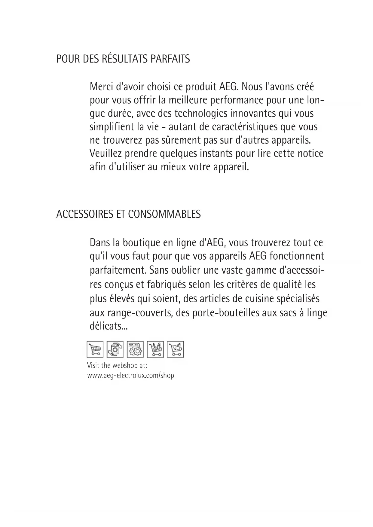 Dans la boutique en ligne d'AEG, vous trouverez tout ce qu'il vous faut pour que vos appareils AEG fonctionnent parfaitement. Sans oublier une vaste gamme d'accessoi- res conçus et fabriqués selon les critères de qualité les plus élevés qui soient, des articles de cuisine spécialisés aux range-couverts, des porte-bouteilles aux sacs à linge délicats... Visit the webshop at: www.aeg-electrolux.com/shopFR - CONSEILS ET SUGGESTIONS