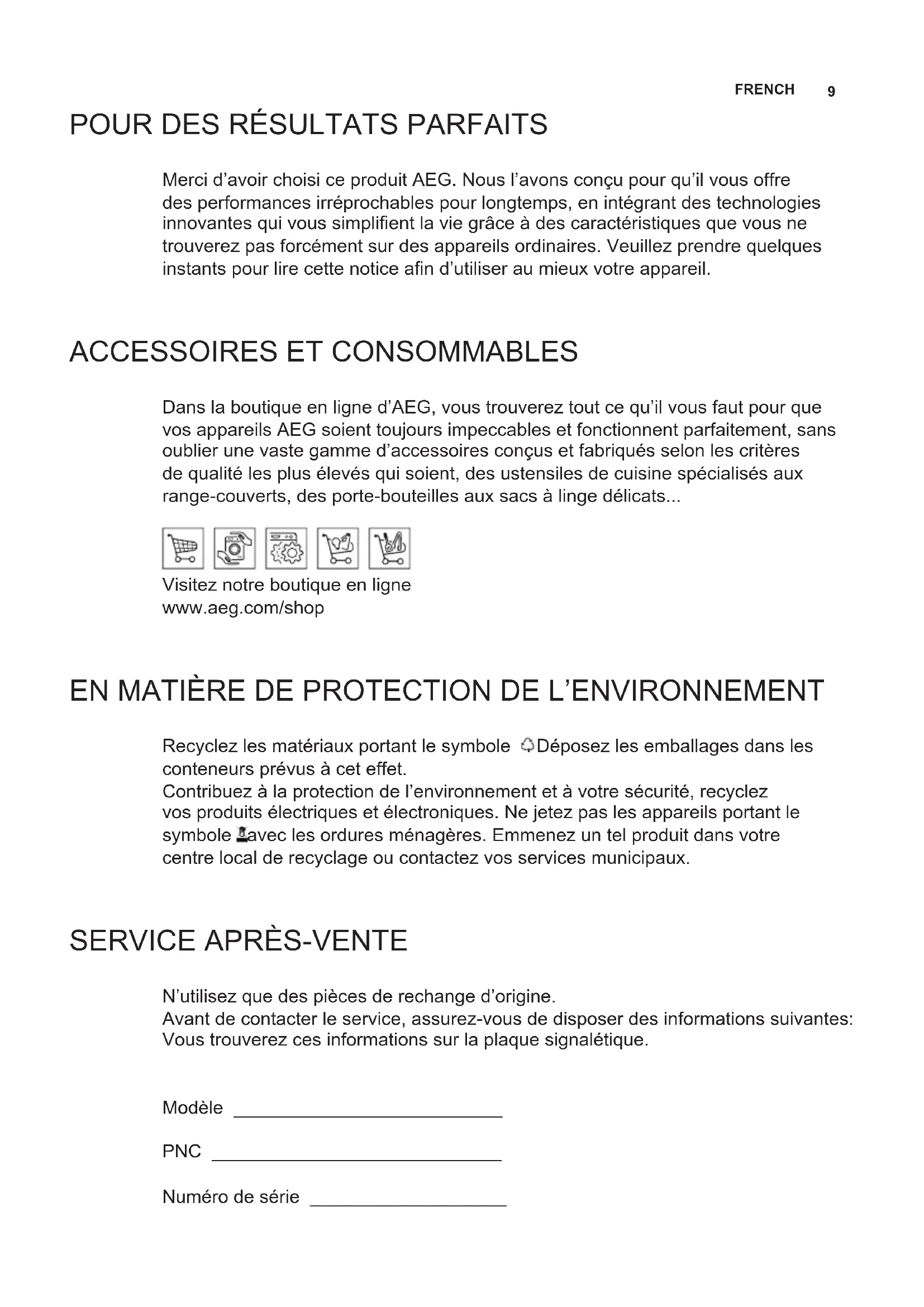 Dans la boutique en ligne d’AEG, vous trouverez tout ce qu’il vous faut pour que vos appareils AEG soient toujours impeccables et fonctionnent parfaitement, sans oublier une vaste gamme d’accessoires conçus et fabriqués selon les critères de qualité les plus élevés qui soient, des ustensiles de cuisine spécialisés aux range-couverts, des porte-bouteilles aux sacs à linge délicats... Visitez notre boutique en ligne www.aeg.com/shop EN MATIÈRE DE PROTECTION DE L’ENVIRONNEMENT Recyclez les matériaux portant le symbole . Déposez les emballages dans les conteneurs prévus à cet effet. Contribuez à la protection de l’environnement et à votre sécurité, recyclez vos produits électriques et électroniques. Ne jetez pas les appareils portant le symbole avec les ordures ménagères. Emmenez un tel produit dans votre centre local de recyclage ou contactez vos services municipaux.