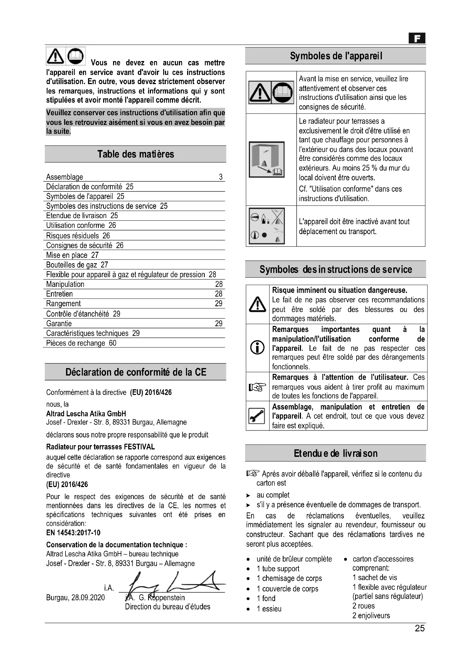 Conformément à la directive (EU) 2016/426 nous, la Altrad Lescha Atika GmbH Josef - Drexler - Str. 8, 89331 Burgau, Allemagne déclarons sous notre propre responsabilité que le produit Radiateur pour terrasses FESTIVAL auquel cette déclaration se rapporte correspond aux exigences de sécurité et de santé fondamentales en vigueur de la directive (EU) 2016/426 Pour le respect des exigences de sécurité et de santé mentionnées dans les directives de la CE, les normes et spécifications techniques suivantes ont été prises en considération: EN 14543:2017-10 Conservation de la documentation technique : Altrad Lescha Atika GmbH – bureau technique Josef - Drexler - Str. 8, 89331 Burgau – Allemagne