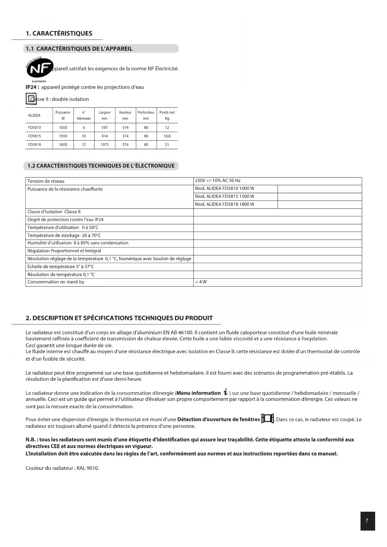 Tension de réseau 230V +/-10% AC 50 Hz Puissance de la résistance chauffante Mod. ALIDEA FD5810 1000 W Mod. ALIDEA FD5815 1500 W Mod. ALIDEA FD5818 1800 W Classe d’isolation Classe II Degré de protection contre l’eau IP24 Température d’utilisation 0 à 50°C Température de stockage -20 à 70°C Humidité d’utilisation 0 à 85% sans condensation Régulation Proportionnel et Intégral Résolution réglage de la température 0,1 °C, Numérique avec bouton de réglage Échelle de température 5° à 37°C Résolution de température 0,1 °C Consommation en stand-by < 4 W ALIDEA Puissance