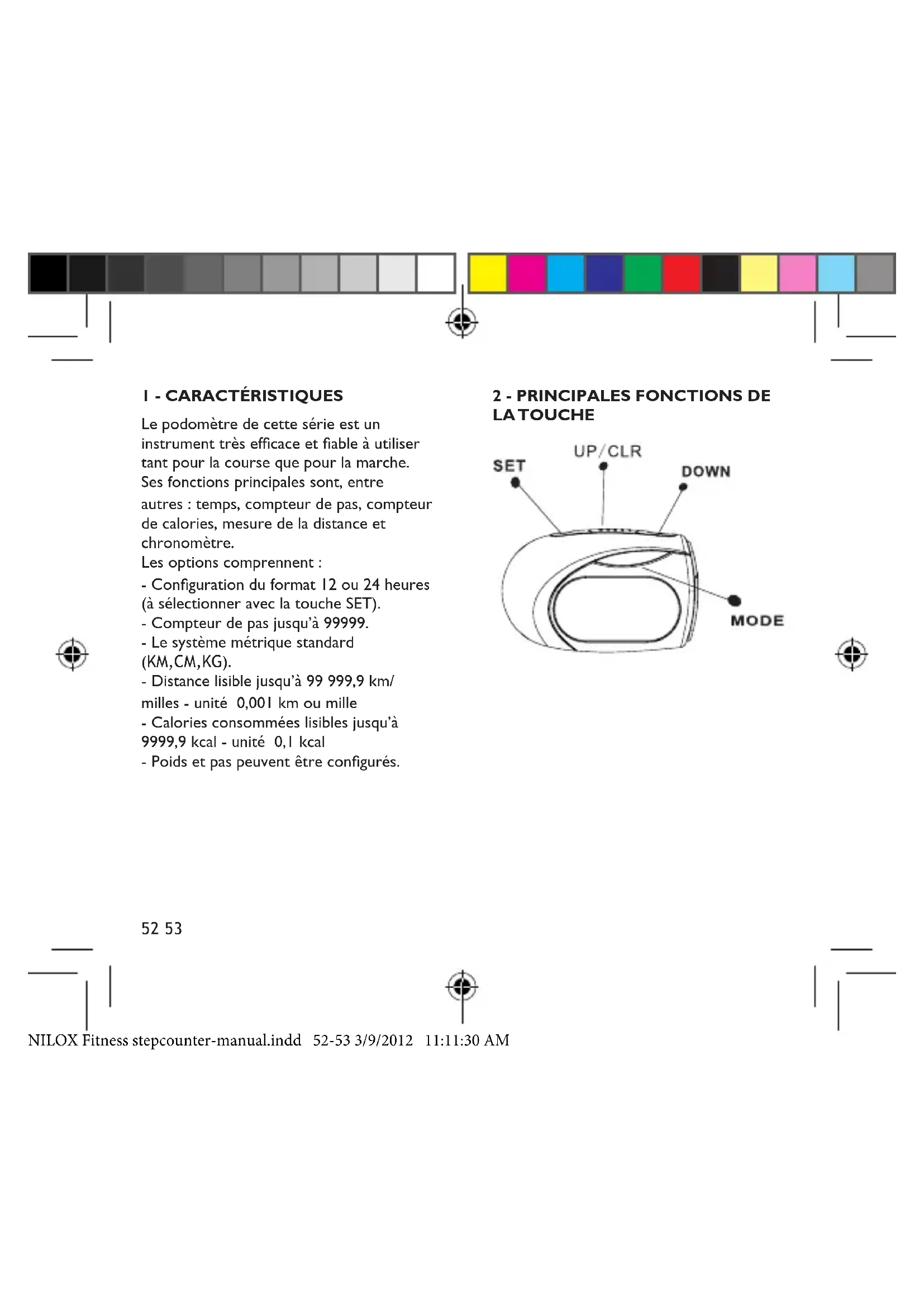 Le podomètre de cette série est un instrument très efcace et able à utiliser tant pour la course que pour la marche. Ses fonctions principales sont, entre autres : temps, compteur de pas, compteur de calories, mesure de la distance et chronomètre. Les options comprennent : - Conguration du format 12 ou 24 heures (à sélectionner avec la touche SET). - Compteur de pas jusqu’à 99999. - Le système métrique standard (KM,CM,KG). - Distance lisible jusqu’à 99 999,9 km/ milles - unité 0,001 km ou mille - Calories consommées lisibles jusqu’à 9999,9 kcal - unité 0,1 kcal - Poids et pas peuvent être congurés.