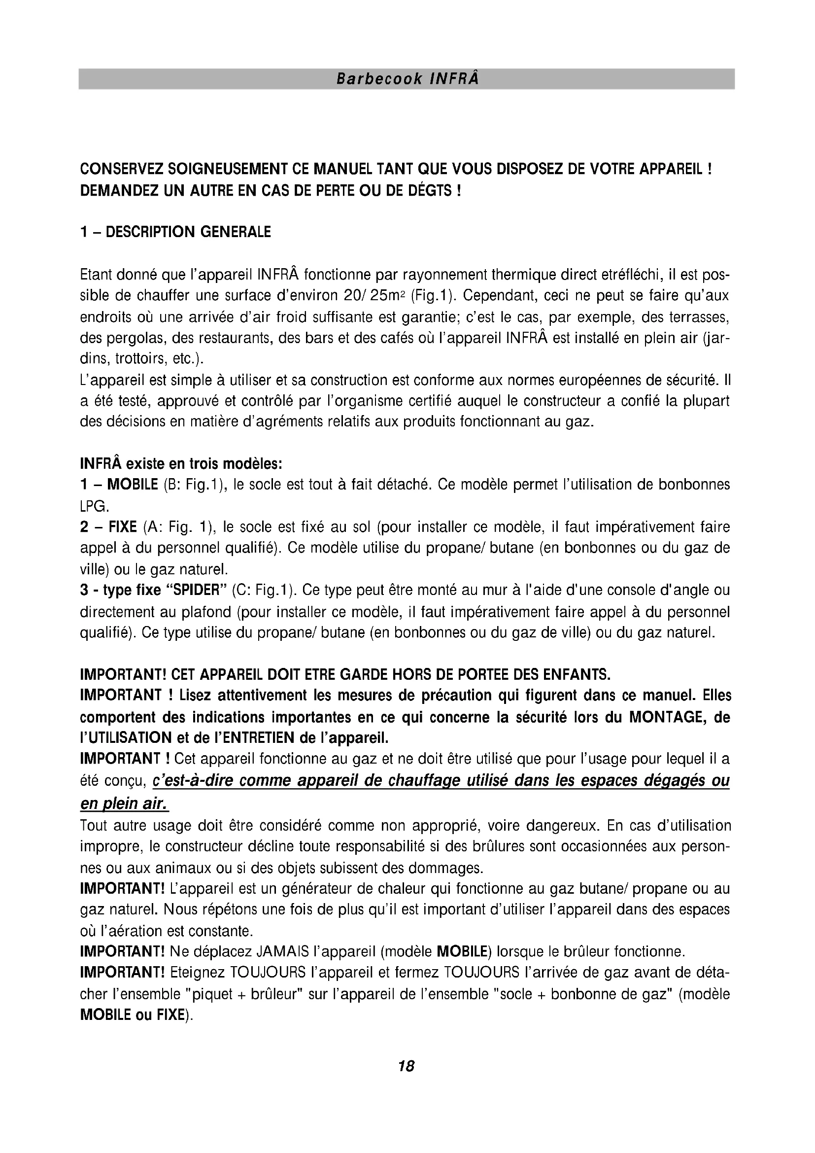 IMPORTANT! L'appareil est un générateur de chaleur qui fonctionne au gaz butane/ propane ou au gaz naturel. Nous repétons une fois de plus qu'il est important d'utiliser l'appareil dans des espaces où l'aération est constante.