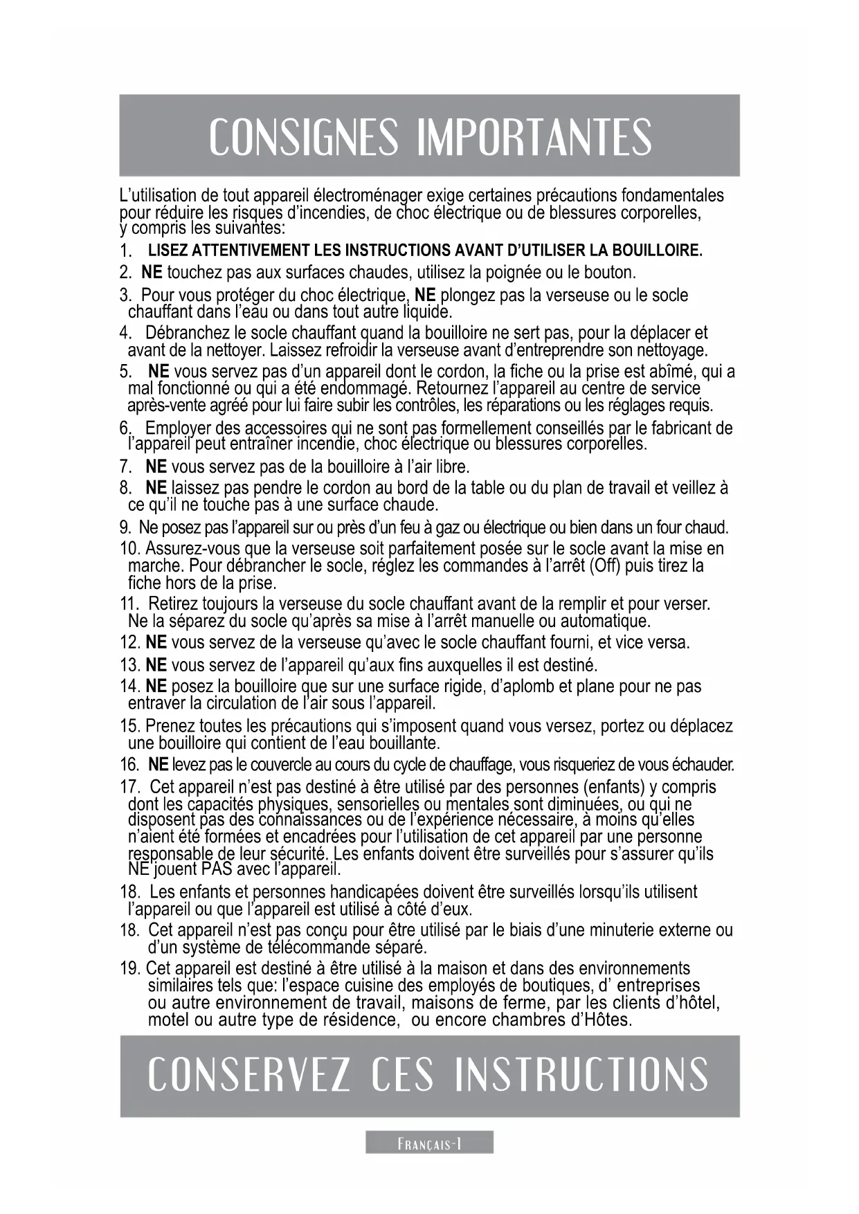 OBSERVAÇÃO: Nunca use produtos químicos, palha de aço ou outros produtos de limpeza abrasivos para limpar qualquer parte da jarra elétrica ou de sua base.Français-1 CONSIGNES IMPORTANTES L’utilisation de tout appareil électroménager exige certaines précautions fondamentales pour réduire les risques d’incendies, de choc électrique ou de blessures corporelles, y compris les suivantes: