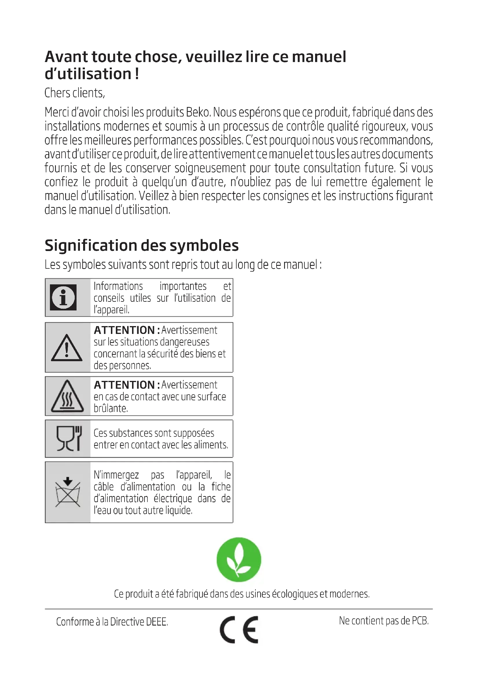 - Cihazın düşürülmesi durumunda cihaz çalışmayabilir veya kalıcı hasar oluşabilir.Avant toute chose, veuillez lire ce manuel d’utilisation ! Chers clents, Merc d’avor chos les produts Beko. Nous espérons que ce produt, fabrqué dans des nstallatons modernes et soums à un processus de contrôle qualté rgoureux, vous offre les melleures performances possbles. C’est pourquo nous vous recommandons, avant d’utlser ce produt, de lre attentvement ce manuel et tous les autres documents fourns et de les conserver sogneusement pour toute consultaton future. S vous confez le produt à quelqu’un d’autre, n’oublez pas de lu remettre également le manuel d’utlsaton. Vellez à ben respecter les consgnes et les nstructons fgurant dans le manuel d’utlsaton. Signification des symboles Les symboles suvants sont reprs tout au long de ce manuel :
