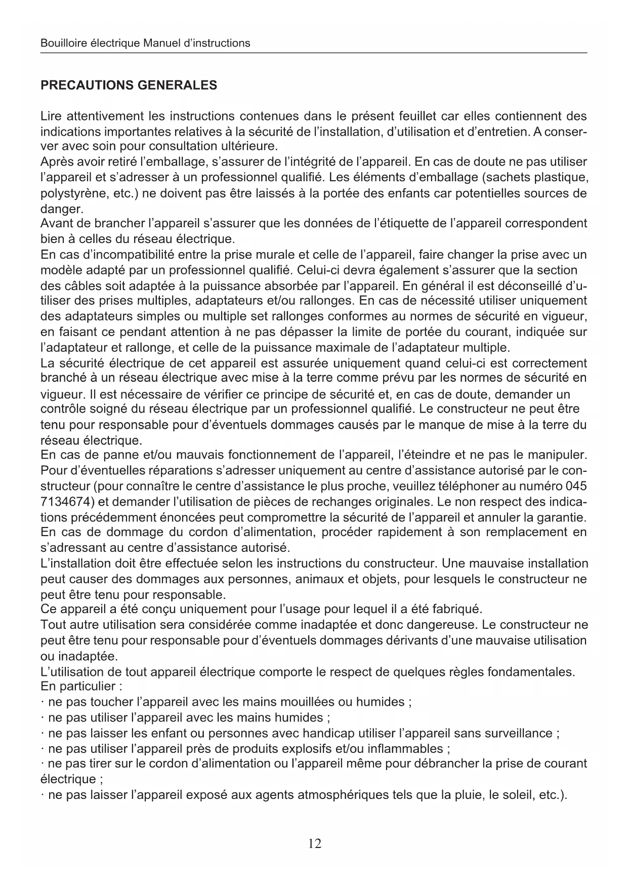 En cas de panne et/ou mauvais fonctionnement de l'appareil, I'éteindre et ne pas le manipuler. Pour d'eventuelles réparations s'adresser uniquement au centre d'assistance autorisé par le constructeur (pour connaître le centre d'assistance le plus proche, veuillez téléphoner au numéro 045 7134674) et demander l'utilisation de pieces de rechanges originales. Le non respect des indicateurs precedemment énoncées peut compromètre la sécurité de l'appareil et annuler la garantie. En cas de dommage du cordon d'alimentation, procéder rapidement à son remplacement en s'adressant au centre d'assistance autorisé.
