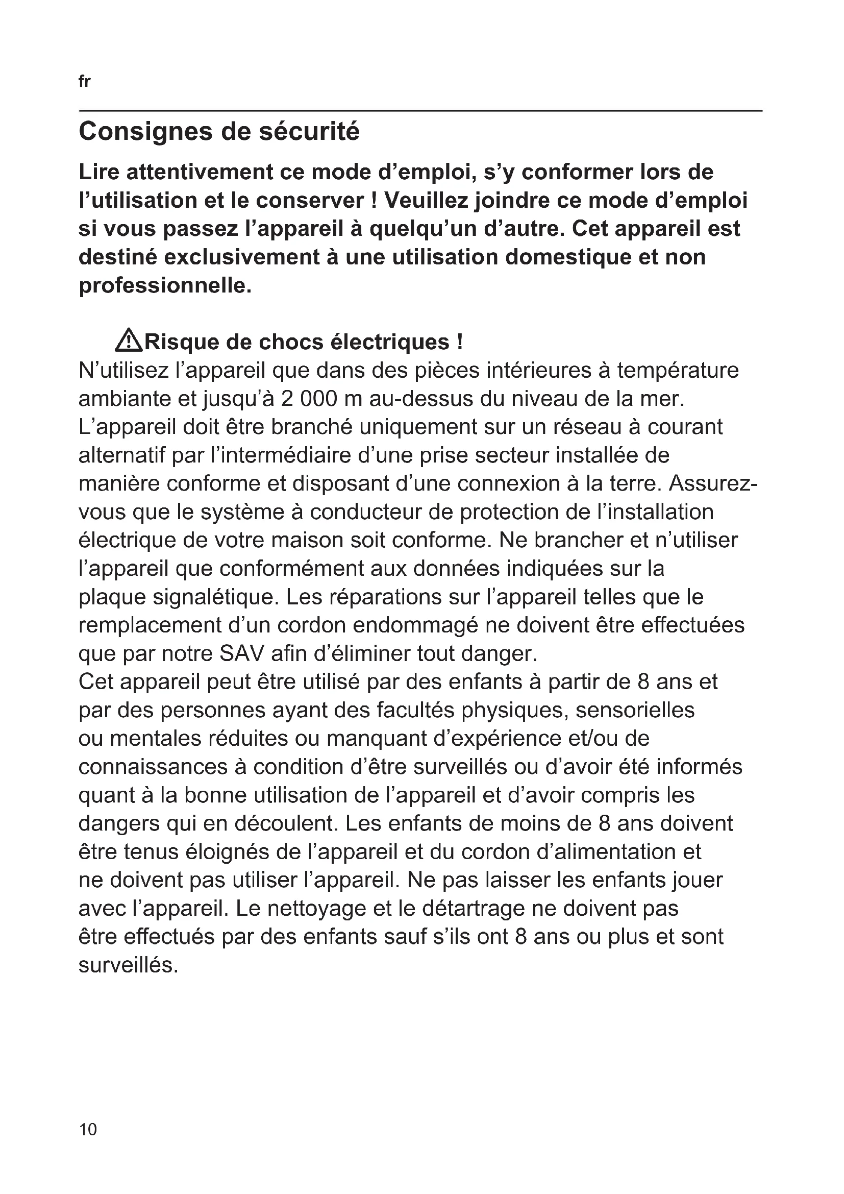 Consignes de sécurité Lire attentivement ce mode d’emploi, s’y conformer lors de l’utilisation et le conserver ! Veuillez joindre ce mode d’emploi si vous passez l’appareil à quelqu’un d’autre. Cet appareil est destiné exclusivement à une utilisation domestique et non professionnelle. WRisque de chocs électriques ! N’utilisez l’appareil que dans des pièces intérieures à température ambiante et jusqu’à 2 000 m au-dessus du niveau de la mer. L’appareil doit être branché uniquement sur un réseau à courant alternatif par l’intermédiaire d’une prise secteur installée de manière conforme et disposant d’une connexion à la terre. Assurez- vous que le système à conducteur de protection de l’installation électrique de votre maison soit conforme. Ne brancher et n’utiliser l’appareil que conformément aux données indiquées sur la plaque signalétique. Les réparations sur l’appareil telles que le remplacement d’un cordon endommagé ne doivent être eectuées que par notre SAV an d’éliminer tout danger. Cet appareil peut être utilisé par des enfants à partir de 8 ans et par des personnes ayant des facultés physiques, sensorielles ou mentales réduites ou manquant d’expérience et/ou de connaissances à condition d’être surveillés ou d’avoir été informés quant à la bonne utilisation de l’appareil et d’avoir compris les dangers qui en découlent. Les enfants de moins de 8 ans doivent être tenus éloignés de l’appareil et du cordon d’alimentation et ne doivent pas utiliser l’appareil. Ne pas laisser les enfants jouer avec l’appareil. Le nettoyage et le détartrage ne doivent pas être eectués par des enfants sauf s’ils ont 8 ans ou plus et sont surveillés.11