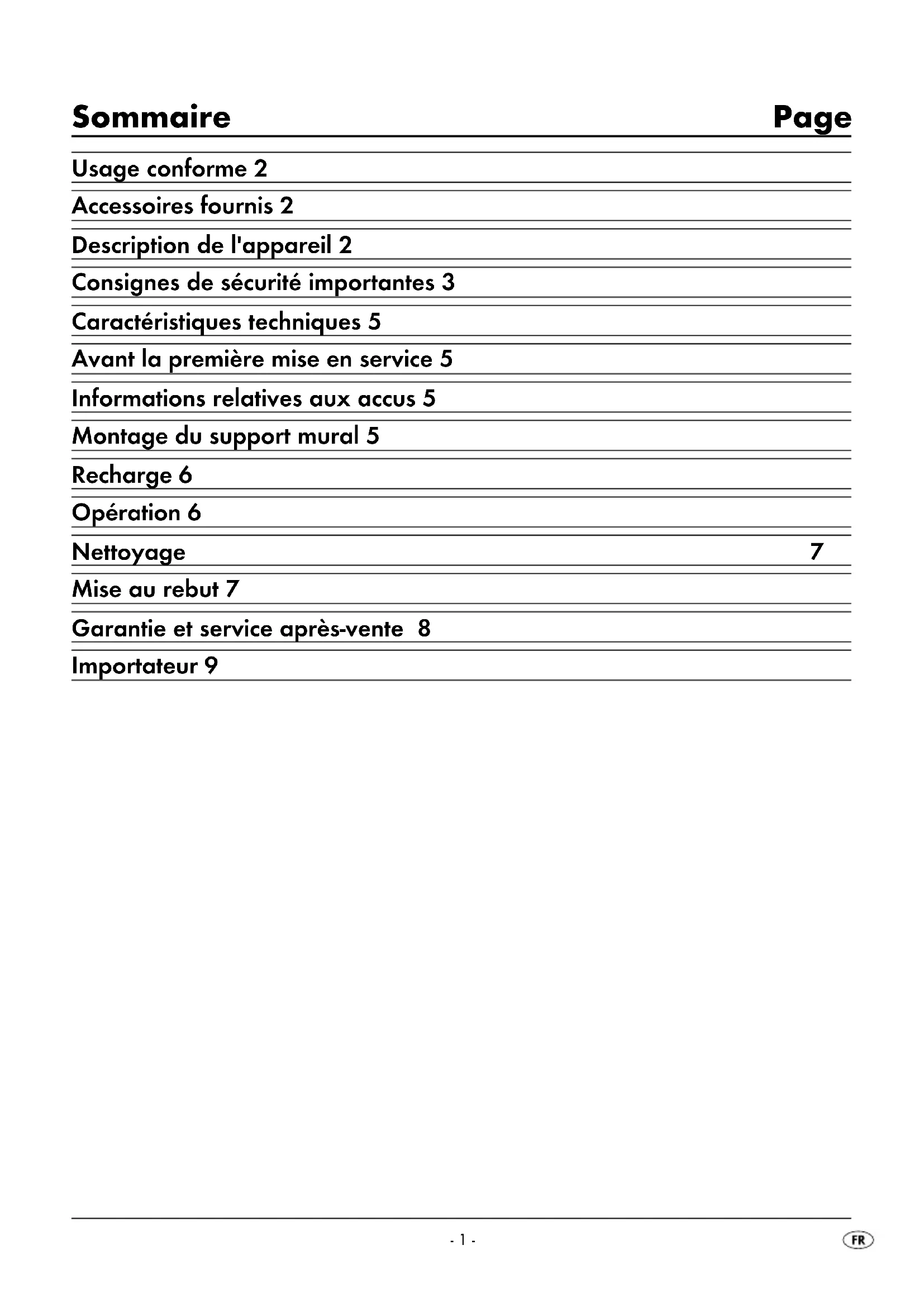 Sommaire Page Usage conforme 2 Accessoires fournis 2 Description de l'appareil 2 Consignes de sécurité importantes 3 Caractéristiques techniques 5 Avant la première mise en service 5 Informations relatives aux accus 5 Montage du support mural 5 Recharge 6 Opération 6 Nettoyage 7 Mise au rebut 7 Garantie et service après-vente 8 Importateur 9 IB_96715_SAS7.4LIA1_LB2.qxp 13.02.2014 14:22 Uhr Seite 1- 2 - Aspirateur à main à batterie Li-ion Toutes nos félicitations pour l'achat de votre nouvel appareil. Vous avez choisi un produit de grande qualité. Le mode d'emploi fait partie de ce produit. Il contient des remarques importantes concernant la sécurité, l'utili- sation et la mise au rebut. Veuillez vous familiariser avec l'ensemble des consignes d'opération et de sécurité avant l'usage du produit. N'utilisez le pro- duit que conformément aux consignes et pour les domaines d'utilisation prévus. En cas de transfert du produit à un tiers, remettez-lui également tous les documents. Usage conforme L'aspirateur de table doit uniquement être utilisé pour aspirer des surfaces sèches ou humides ou des éléments secs ou humides ou encore des liquides. Cet appareil n'est pas prévu pour aspirer sur des personnes ou des animaux. Toute autre utilisation ou modification de l'appareil est considérée comme non conforme et comporte d'importants risques d'accident. Le fabricant n'endosse aucune responsa- bilité pour l'utilisation non conforme ou la mauvaise utilisation de l'appareil. L'appareil n'est pas destiné à un usage commercial. Accessoires fournis Aspirateur à main à batterie Li-ion Suceur étroit Embout pour aspiration de liquides Support mural Matériel de montage Bloc d'alimentation Mode d'emploi Directement après le déballage, contrôlez que la livraison est bien complète. Description de l'appareil 1 Embout pour aspiration de liquides 2 Suceur étroit 3 Support mural 4 Bloc d'alimentation 5 Fiche creuse 6 Bouton de mise en marche/d'arrêt 7 Voyant de contrôle de charge 8 Touche de déverrouillage 9 Sac à poussière 0 Filtre à poussière q Bac à déchets Remarque : L'appareil est livré avec des accus non chargés. Avant la première utilisation de l'appareil, les accus doivent être préalablement chargés pendant 24 heures. IB_96715_SAS7.4LIA1_LB2.qxp 13.02.2014 14:22 Uhr Seite 2- 3 - Consignes de sécurité importantes Afin d'éviter tout danger de mort par électrocution :