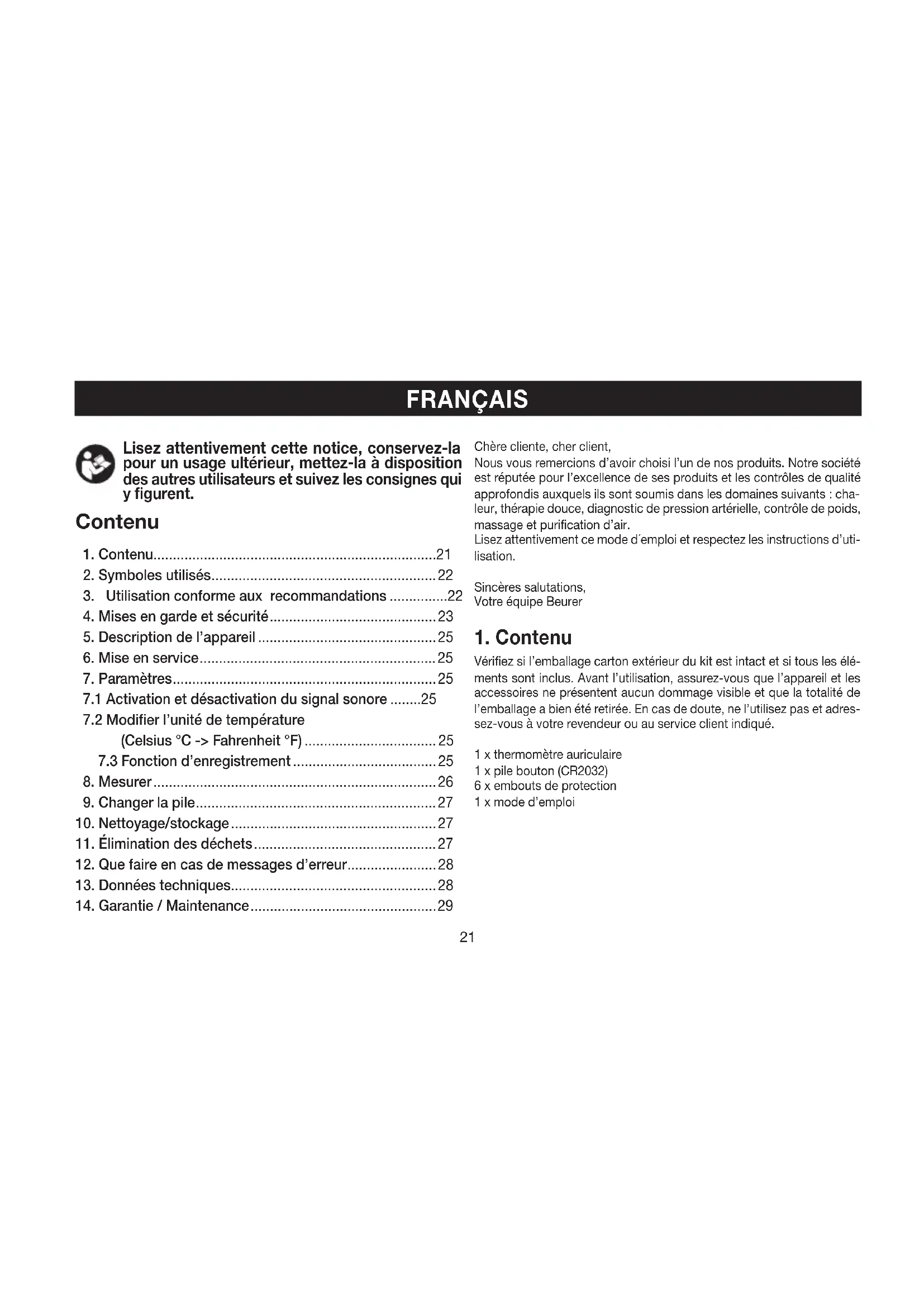 FRANÇAIS Chère cliente, cher client,Nous vous remercions d’avoir choisi l’un de nos produits. Notre société est réputée pour l’excellence de ses produits et les contrôles de qualité approfondis auxquels ils sont soumis dans les domaines suivants: cha-leur, thérapie douce, diagnostic de pression artérielle, contrôle de poids, massage et purification d’air.Lisez attentivement ce mode d´emploi et respectez les instructions d’uti-lisation.Sincères salutations,Votre équipe Beurer