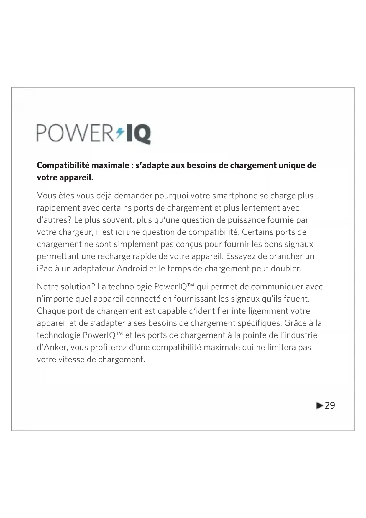 当社の製品に関するお問い合わせやご意見は、support@ianker.com までメー ルをいただくか、サポートセンター 03-4455-7823 までお電話にてお願い致し ます。当社サポート担当者が、速やかにご対応申し上げます。 アフターサービスと保証のご提供に関して 当社は、Anker 公式ウェブサイト(http://www.ianker.com/)、Amazon.co.jp ・楽天市場における Anker 公式ショップ、または当社が認める小売業者から 購入された製品に対してのみ、アフターサービスと製品保証を提供しておりま す。他の小売業者から購入された製品の交換、返品、返金に関しましては 購 入先へお問い合わせ下さい。あらかじめご了承のほどお願い申し上げます。29 Compatibilité maximale : s’adapte aux besoins de chargement unique de votre appareil. Vous êtes vous déjà demander pourquoi votre smartphone se charge plus rapidement avec certains ports de chargement et plus lentement avec d’autres? Le plus souvent, plus qu’une question de puissance fournie par votre chargeur, il est ici une question de compatibilité. Certains ports de chargement ne sont simplement pas conçus pour fournir les bons signaux permettant une recharge rapide de votre appareil. Essayez de brancher un iPad à un adaptateur Android et le temps de chargement peut doubler. Notre solution? La technologie PowerIQ™ qui permet de communiquer avec n’importe quel appareil connecté en fournissant les signaux qu’ils fauent. Chaque port de chargement est capable d’identifier intelligemment votre appareil et de s’adapter à ses besoins de chargement spécifiques. Grâce à la technologie PowerIQ™ et les ports de chargement à la pointe de l’industrie d’Anker, vous profiterez d’une compatibilité maximale qui ne limitera pas votre vitesse de chargement.30 Contenu du pack