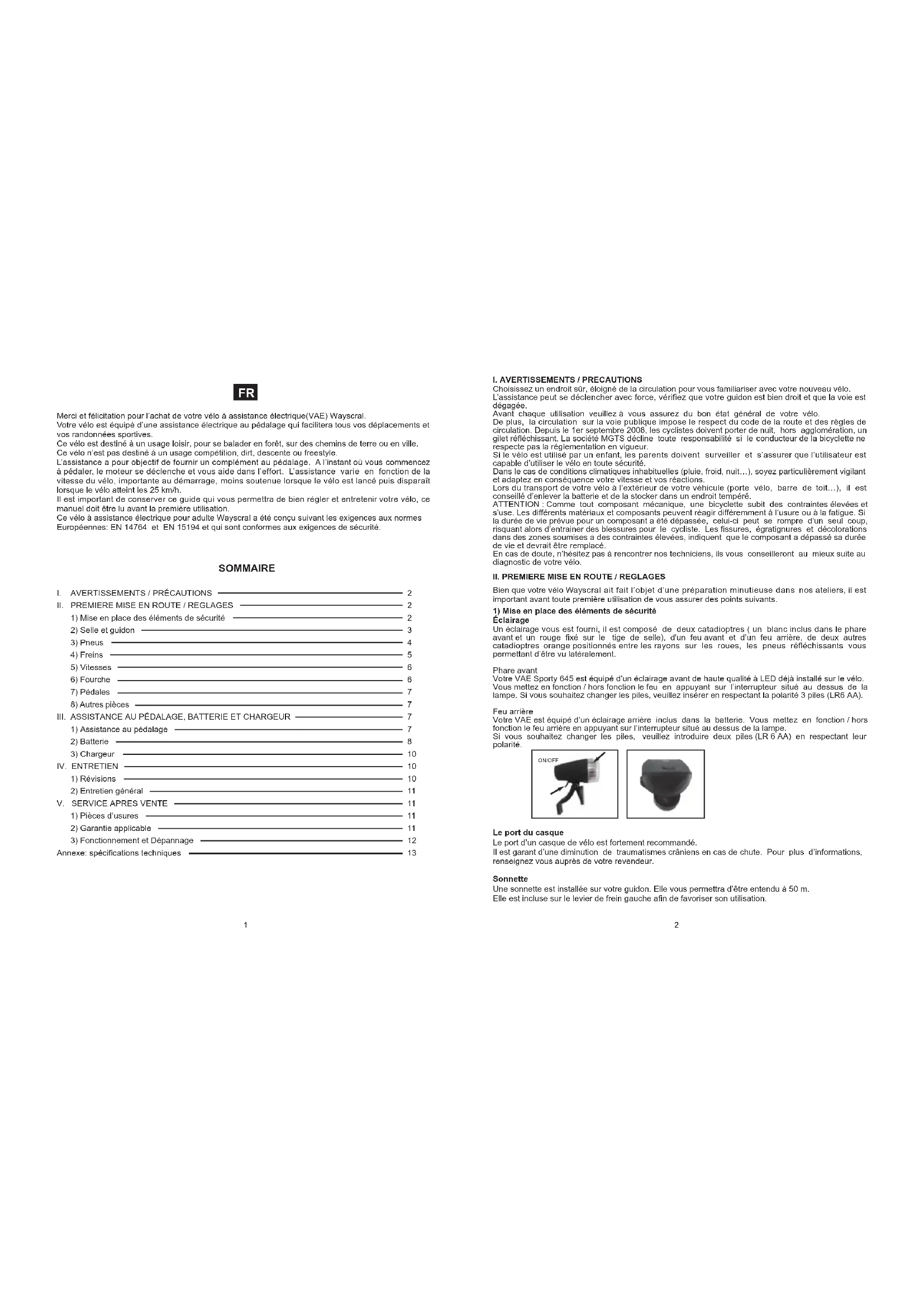 SOMMAIRE Merci et félicitation pour l’achat de votre vélo à assistance électrique(VAE) Wayscral. Votre vélo est équipé d’une assistance électrique au pédalage qui facilitera tous vos déplacements et vos randonnées sportives. Ce vélo est destiné à un usage loisir, pour se balader en forêt, sur des chemins de terre ou en ville. Ce vélo n’est pas destiné à un usage compétition, dirt, descente ou freestyle. L’assistance a pour objectif de fournir un complément au pédalage. A l’instant où vous commencez à pédaler, le moteur se déclenche et vous aide dans l’effort. L’assistance varie en fonction de la vitesse du vélo, importante au démarrage, moins soutenue lorsque le vélo est lancé puis disparaît lorsque le vélo atteint les 25 km/h. Il est important de conserver ce guide qui vous permettra de bien régler et entretenir votre vélo, ce manuel doit être lu avant la première utilisation. Ce vélo à assistance électrique pour adulte Wayscral a été conçu suivant les exigences aux normes Européennes: EN 14764 et EN 15194 et qui sont conformes aux exigences de sécurité.