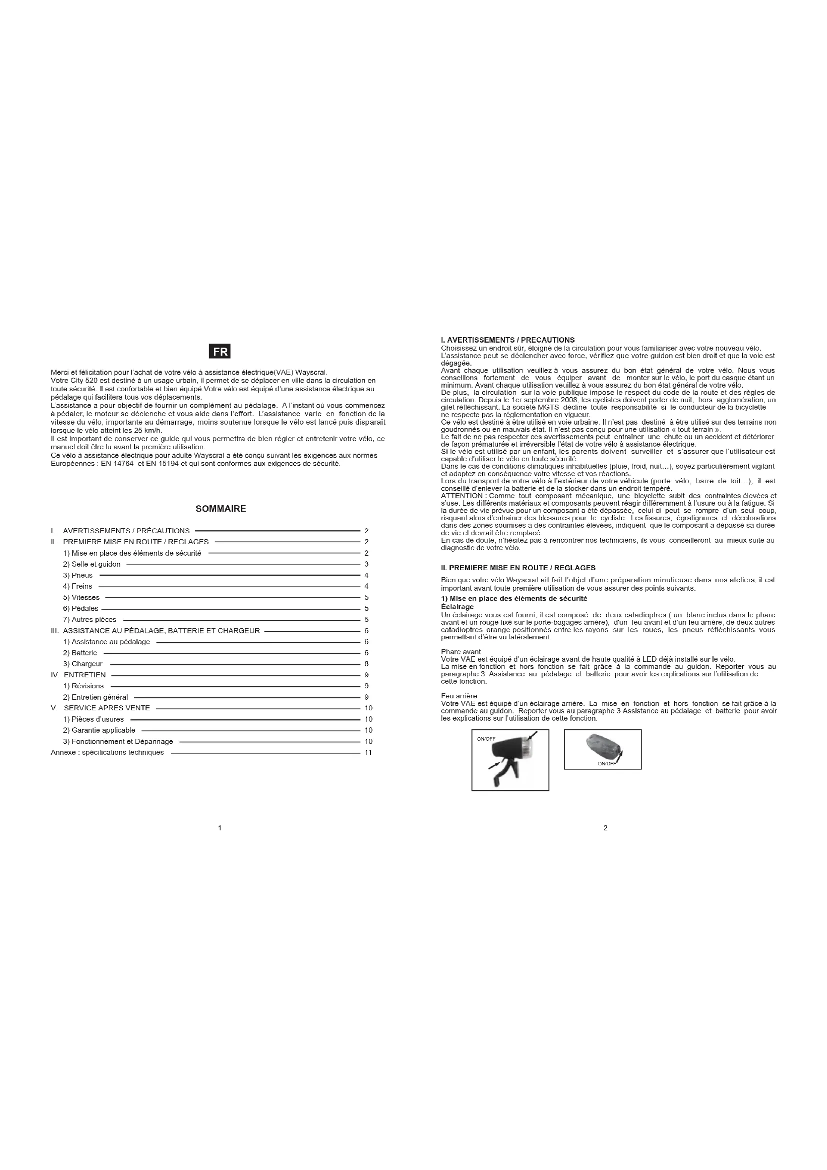 SOMMAIRE Merci et félicitation pour l’achat de votre vélo à assistance électrique(VAE) Wayscral. Votre City 520 est destiné à un usage urbain, il permet de se déplacer en ville dans la circulation en toute sécurité. Il est confortable et bien équipé.Votre vélo est équipé d’une assistance électrique au pédalage qui facilitera tous vos déplacements. L’assistance a pour objectif de fournir un complément au pédalage. A l’instant où vous commencez à pédaler, le moteur se déclenche et vous aide dans l’effort. L’assistance varie en fonction de la vitesse du vélo, importante au démarrage, moins soutenue lorsque le vélo est lancé puis disparaît lorsque le vélo atteint les 25 km/h. Il est important de conserver ce guide qui vous permettra de bien régler et entretenir votre vélo, ce manuel doit être lu avant la première utilisation. Ce vélo à assistance électrique pour adulte Wayscral a été conçu suivant les exigences aux normes Européennes : EN 14764 et EN 15194 et qui sont conformes aux exigences de sécurité.