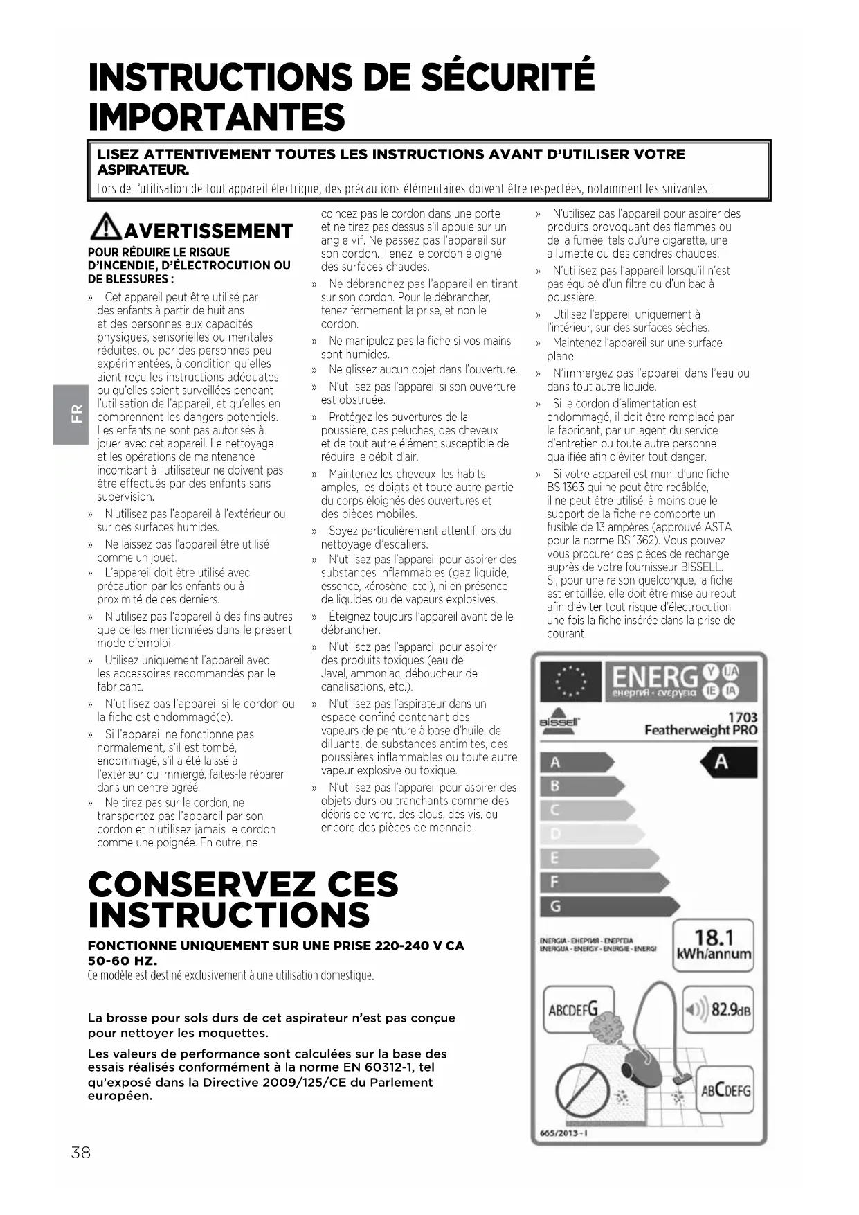 - IMPORTANTES AVERTISSEMENT POUR RÉDUIRE LE RISQUE D’INCENDIE, D’ÉLECTROCUTION OU DE BLESSURES:» Cet appareil peut être utilisé par des enfants à partir de huitans et des personnes aux capacités physiques, sensorielles ou mentales réduites, ou par des personnes peu expérimentées, à condition qu’elles aient reçu les instructions adéquates ou qu’elles soient surveillées pendant l’utilisation de l’appareil, et qu’elles en comprennent les dangers potentiels. Les enfants ne sont pas autorisés à jouer avec cet appareil. Le nettoyage et les opérations de maintenance incombant à l’utilisateur ne doivent pas être effectués par des enfants sans supervision.» N’utilisez pas l’appareil à l’extérieur ou sur des surfaces humides.» Ne laissez pas l’appareil être utilisé comme un jouet.» L’appareil doit être utilisé avec précaution par les enfants ou à proximité de ces derniers.» N’utilisez pas l’appareil à des fins autres que celles mentionnées dans le présent mode d’emploi.» Utilisez uniquement l’appareil avec les accessoires recommandés par le fabricant.» N’utilisez pas l’appareil si le cordon ou la fiche est endommagé(e).» Si l’appareil ne fonctionne pas normalement, s’il est tombé, endommagé, s’il a été laissé à l’extérieur ou immergé, faites-le réparer dans un centre agréé.» Ne tirez pas sur le cordon, ne transportez pas l’appareil par son cordon et n’utilisez jamais le cordon comme une poignée. En outre, ne coincez pas le cordon dans une porte et ne tirez pas dessus s’il appuie sur un angle vif. Ne passez pas l’appareil sur son cordon. Tenez le cordon éloigné des surfaces chaudes.» Ne débranchez pas l’appareil en tirant sur son cordon. Pour le débrancher, tenez fermement la prise, et non le cordon.» Ne manipulez pas la fiche si vos mains sont humides.» Ne glissez aucun objet dans l’ouverture.» N’utilisez pas l’appareil si son ouverture est obstruée.» Protégez les ouvertures de la poussière, des peluches, des cheveux et de tout autre élément susceptible de réduire le débit d’air.» Maintenez les cheveux, les habits amples, les doigts et toute autre partie du corps éloignés des ouvertures et des pièces mobiles.» Soyez particulièrement attentif lors du nettoyage d’escaliers.» N’utilisez pas l’appareil pour aspirer des substances inflammables (gaz liquide, essence, kérosène, etc.), ni en présence de liquides ou de vapeurs explosives.» Éteignez toujours l’appareil avant de le débrancher.» N’utilisez pas l’appareil pour aspirer des produits toxiques (eau de Javel, ammoniac, déboucheur de canalisations, etc.).» N’utilisez pas l’aspirateur dans un espace confiné contenant des vapeurs de peinture à base d’huile, de diluants, de substances antimites, des poussières inflammables ou toute autre vapeur explosive ou toxique.» N’utilisez pas l’appareil pour aspirer des objets durs ou tranchants comme des débris de verre, des clous, des vis, ou encore des pièces de monnaie.» N’utilisez pas l’appareil pour aspirer des produits provoquant des flammes ou de la fumée, tels qu’une cigarette, une allumette ou des cendres chaudes.» N’utilisez pas l’appareil lorsqu’il n’est pas équipé d’un filtre ou d’un bac à poussière.» Utilisez l’appareil uniquement à l’intérieur, sur des surfaces sèches.» Maintenez l’appareil sur une surface plane.» N’immergez pas l’appareil dans l’eau ou dans tout autre liquide.» Si le cordon d’alimentation est endommagé, il doit être remplacé par le fabricant, par un agent du service d’entretien ou toute autre personne qualifiée afin d’éviter tout danger.» Si votre appareil est muni d’une fiche BS1363 qui ne peut être recâblée, il ne peut être utilisé, à moins que le support de la fiche ne comporte un fusible de 13ampères (approuvé ASTA pour la norme BS1362). Vous pouvez vous procurer des pièces de rechange auprès de votre fournisseur BISSELL. Si, pour une raison quelconque, la fiche est entaillée, elle doit être mise au rebut afin d’éviter tout risque d’électrocution une fois la fiche insérée dans la prise de courant. CONSERVEZ CES INSTRUCTIONS FONCTIONNE UNIQUEMENT SUR UNE PRISE 220-240VCA 50-60HZ. Ce modèle est destiné exclusivement à une utilisation domestique. LISEZ ATTENTIVEMENT TOUTES LES INSTRUCTIONS AVANT D’UTILISER VOTRE ASPIRATEUR. Lors de l’utilisation de tout appareil électrique, des précautions élémentaires doivent être respectées, notamment les suivantes: La brosse pour sols durs de cet aspirateur n’est pas conçue pour nettoyer les moquettes.Les valeurs de performance sont calculées sur la base des essais réalisés conformément à la norme EN60312-1, tel qu’exposé dans la Directive2009/125/CE du Parlement européen. FR39 Merci d’avoir acheté un aspirateur BISSELL Nous sommes ravis que vous ayez acheté un aspirateur BISSELL. La conception et la fabrication de ce système de nettoyeur ménager complet haute technologie résultent de notre longue expérience dans le domaine de l’entretien des sols. Gage de sa qualité, votre aspirateur BISSELL est assorti d’une garantie limitée d’un an. Vous bénéficiez également des compétences et du dévouement de notre service client, qui vous apportera une aide rapide en cas deproblème. Mon arrière-grand-père a inventé le balai mécanique en1876. BISSELL est aujourd’hui l’un des leaders mondiaux de la conception, de la fabrication et de l’entretien de produits d’entretien ménagers de haute qualité, comme votre aspirateur BISSELL. Toute l’équipe de BISSEL tient à vous remercier encore une fois pour votre achat. Mark J. Bissell Président Directeur Général Instructions de sécurité p. 38