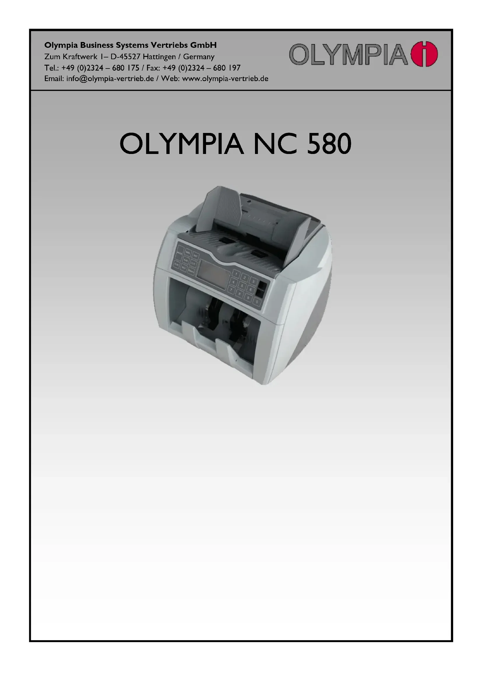 Modes de comptage et sélection de la devise Le NC 580 peut compter des billets triés et mixtes (selon la devise). La touche « MODE » permet de choisir l’un ou l’autre de ces modes ou le mode de comptage libre. Il se peut que les devises autres que l’Euro soient désactivées sur votre machine. Dans ce cas, vous pouvez les activer par vous-même en suivant les instructions du manuel complet disponible sur notre site internet. Calcul de valeur / billets mixtes (EU-MIX) Ce mode de comptage vous permet de compter des billets triés ou non-triés en fonction de leur valeur et de voir le résultat évalué dans le menu rapport. Appuyez sur la touche « REP » pour obtenir un résumé du nombre de billets comptés par dénomination. Le rapport indique la somme de chaque dénomination ainsi que la somme total des billets. Comptage valorisé / billets triés (EU-SORT) Sur ce mode de comptage, la machine s'arrête dès qu'elle détecte un billet dont la valeur est différente de celle du premier billet de la pile. Vous pouvez ainsi rechercher de plus grosses quantités de billets similaires, notamment pour des valeurs plus petites, et obtenir la quantité totale des billets. Mode de comptage libre (FREE-COUNT) En mode de comptage libre, le système de détection de faux billets est en général désactivé et le NC 580 compte toutes sortes de papiers ou billets que la machine accepte. Mode de comptage libre avec détection UV (FREE-COUNT-UV) Ce mode fonctionne comme le mode de comptage libre normal pour les papiers et billets acceptés selon les caractéristiques techniques du NC 580. Dans ce mode, les billets/papiers seront également détectés par la fonctionnalité de sécurité UV. Nettoyage des capteurs L’insertion et le rejet des billets entrainent un dépôt de poussière sur les capteurs de la machine, ce qui peut empêcher la reconnaissance des vrais billets par la machine et entrainer des erreurs. Nous vous conseillons de nettoyer régulièrement les capteurs du NC 580. Eteignez la machine lorsque vous la nettoyez et débranchez le câble électrique. A l’aide d’un pinceau et d’un chiffon doux, retirez les plus grosses particules de poussière des capteurs de la trémie et du bac de réception, ainsi que des roulettes d'entrainement des billets. Pour nettoyer les capteurs de reconnaissance de faux billets, nous conseillons l’application supplémentaire d’un spray à jet d’air inflammable pour retirer également la poussière insérée et les particules d’endroits inaccessibles. Si vous avez la moindre question concernant le nettoyage du NC 580, notre équipe d’entretien est bien évidemment à votre écoute. Contact En cas de problème sur votre NC 580 que ce manuel ne vous permet pas de résoudre, veuillez nous contacter par email, en précisant le problème rencontré. Nous vous répondrons dans les meilleurs délais pour vous proposer une solution à ce problème. info@olympia-vertrieb.de Pour que la garantie soit valide, veuillez conserver votre preuve d’achat. Veuillez ne pas décoller, recouvrir ou modifier l'autocollant situé sous l’appareil et indiquant le numéro de série, car cela annulerait votre garantie.