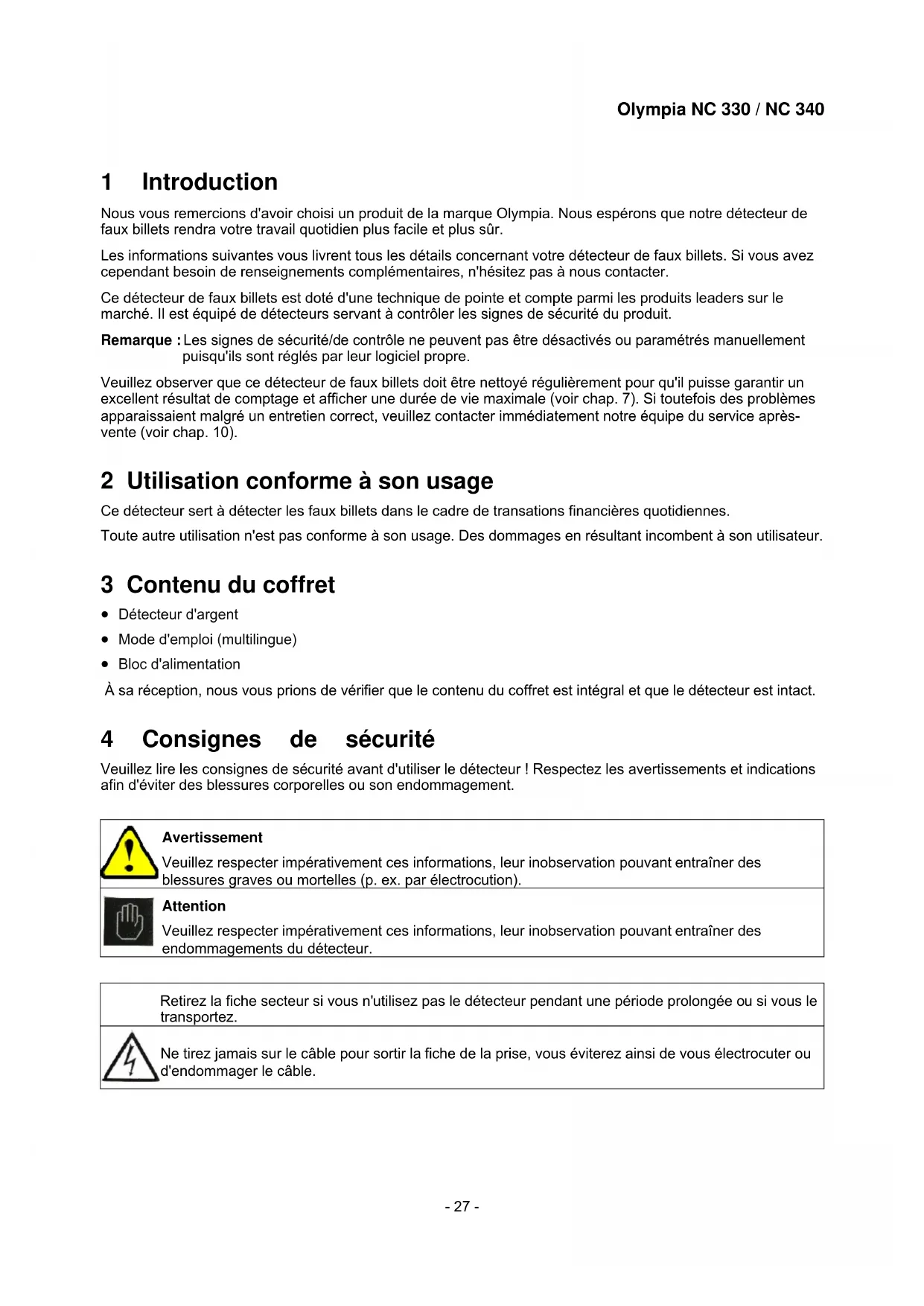 1 Introduction Nous vous remercions d'avoir choisi un produit de la marque Olympia. Nous espérons que notre détecteur de faux billets rendra votre travail quotidien plus facile et plus sûr. Les informations suivantes vous livrent tous les détails concernant votre détecteur de faux billets. Si vous avez cependant besoin de renseignements complémentaires, n'hésitez pas à nous contacter. Ce détecteur de faux billets est doté d'une technique de pointe et compte parmi les produits leaders sur le marché. Il est équipé de détecteurs servant à contrôler les signes de sécurité du produit. Remarque : Les signes de sécurité/de contrôle ne peuvent pas être désactivés ou paramétrés manuellement puisqu'ils sont réglés par leur logiciel propre. Veuillez observer que ce détecteur de faux billets doit être nettoyé régulièrement pour qu'il puisse garantir un excellent résultat de comptage et afficher une durée de vie maximale (voir chap. 7). Si toutefois des problèmes apparaissaient malgré un entretien correct, veuillez contacter immédiatement notre équipe du service après- vente (voir chap. 10). 2 Utilisation conforme à son usage Ce détecteur sert à détecter les faux billets dans le cadre de transations financières quotidiennes. Toute autre utilisation n'est pas conforme à son usage. Des dommages en résultant incombent à son utilisateur. 3 Contenu du coffret