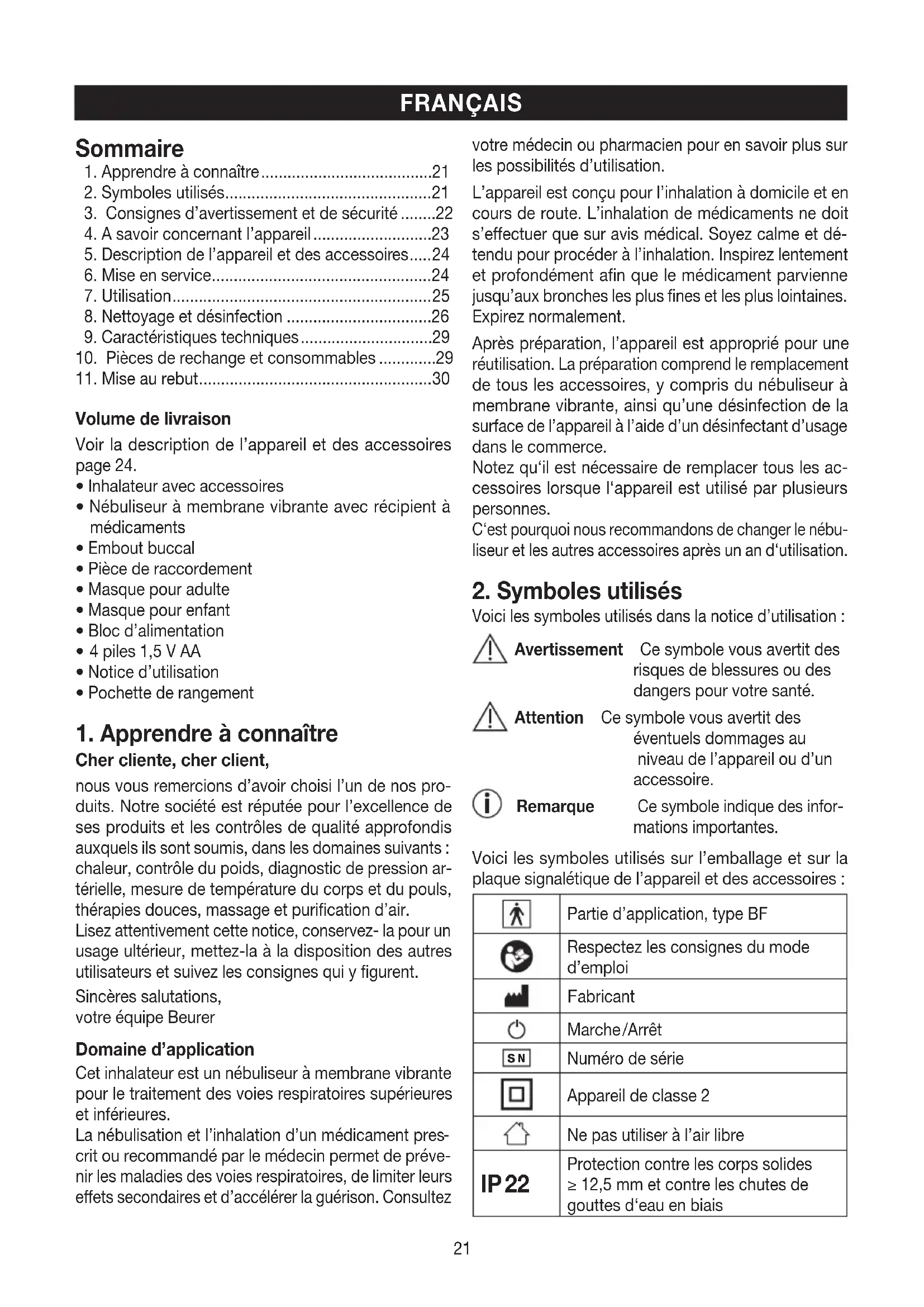 Cher cliente, cher client, nous vous remercions d’avoir choisi l’un de nos pro- duits. Notre société est réputée pour l’excellence de ses produits et les contrôles de qualité approfondis auxquels ils sont soumis, dans les domaines suivants : chaleur, contrôle du poids, diagnostic de pression ar- térielle, mesure de température du corps et du pouls, thérapies douces, massage et purification d’air. Lisez attentivement cette notice, conservez- la pour un usage ultérieur, mettez-la à la disposition des autres utilisateurs et suivez les consignes qui y figurent. Sincères salutations, votre équipe Beurer Domaine d’application Cet inhalateur est un nébuliseur à membrane vibrante pour le traitement des voies respiratoires supérieures et inférieures. La nébulisation et l’inhalation d’un médicament pres