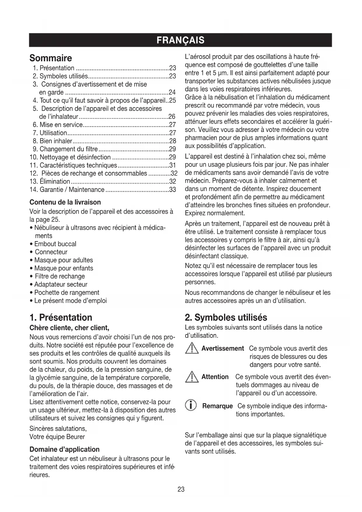 Chère cliente, cher client, Nous vous remercions d’avoir choisi l’un de nos pro- duits. Notre société est réputée pour l’excellence de ses produits et les contrôles de qualité auxquels ils sont soumis. Nos produits couvrent les domaines de la chaleur, du poids, de la pression sanguine, de la glycémie sanguine, de la température corporelle, du pouls, de la thérapie douce, des massages et de l’amélioration de l’air. Lisez attentivement cette notice, conservez-la pour un usage ultérieur, mettez-la à disposition des autres utilisateurs et suivez les consignes qui y figurent. Sincères salutations, Votre équipe Beurer Domaine d’application Cet inhalateur est un nébuliseur à ultrasons pour le traitement des voies respiratoires supérieures et infé