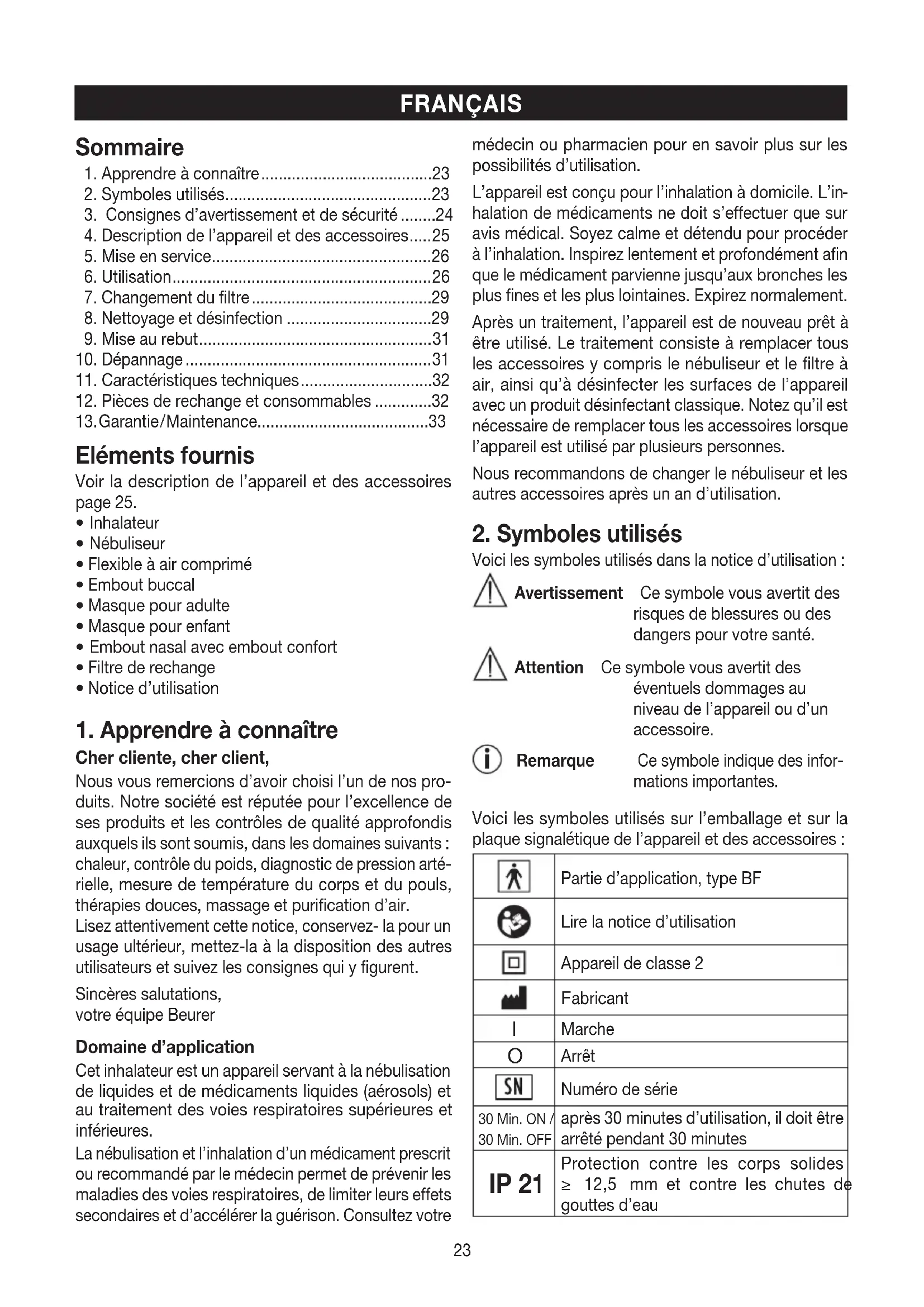 Cher cliente, cher client, Nous vous remercions d’avoir choisi l’un de nos pro- duits. Notre société est réputée pour l’excellence de ses produits et les contrôles de qualité approfondis auxquels ils sont soumis, dans les domaines suivants : chaleur, contrôle du poids, diagnostic de pression arté- rielle, mesure de température du corps et du pouls, thérapies douces, massage et purification d’air. Lisez attentivement cette notice, conservez- la pour un usage ultérieur, mettez-la à la disposition des autres utilisateurs et suivez les consignes qui y figurent. Sincères salutations, votre équipe Beurer Domaine d’application Cet inhalateur est un appareil servant à la nébulisation de liquides et de médicaments liquides (aérosols) et au traitement des voies respiratoires supérieures et inférieures. La nébulisation et l’inhalation d’un médicament prescrit ou recommandé par le médecin permet de prévenir les maladies des voies respiratoires, de limiter leurs effets secondaires et d’accélérer la guérison. Consultez votre médecin ou pharmacien pour en savoir plus sur les possibilités d’utilisation. L’appareil est conçu pour l’inhalation à domicile. L’in