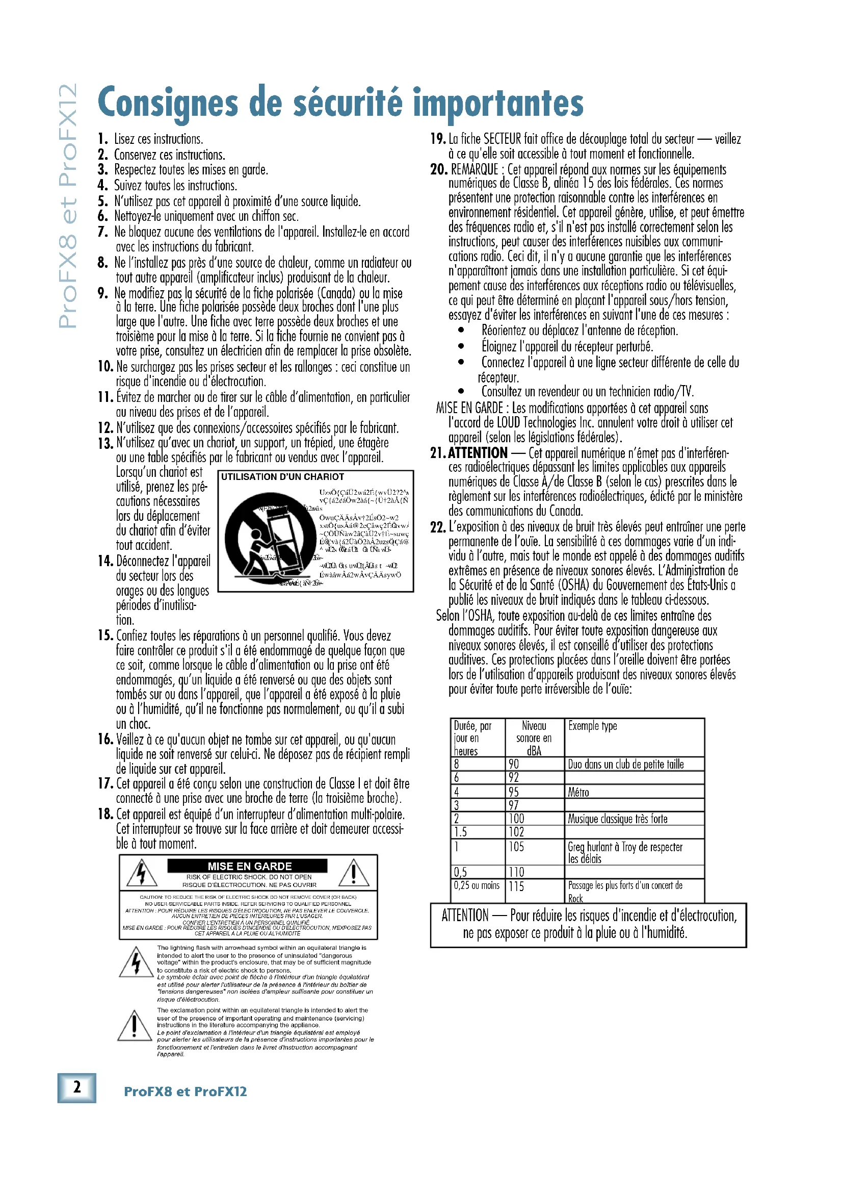 The lightning flash with arrowhead symbol within an equilateral triangle is intended to alert the user to the presence of uninsulated "dangerous voltage" within the product's enclosure, that may be of sufficient magnitude to constitute a risk of electric shock to persons. Le symbole éclair avec point de flèche à l'intérieur d'un triangle équilatéral est utilisé pour alerter l'utilisateur de la présence à l'intérieur du boîtier de "tensions dangereuses" non isolées d'ampleur suffisante pour constituer un risque d'éléctrocution. The exclamation point within an equilateral triangle is intended to alert the user of the presence of important operating and maintenance (servicing) instructions in the literature accompanying the appliance. Le point d'exclamation à l'intérieur d'un triangle équilatéral est employé pour alerter les utilisateurs de la présence d'instructions importantes pour le fonctionnement et l'entretien dans le livret d'instruction accompagnant l'appareil. ATTENTION — Pour réduire les risques d'incendie et d'électrocution, ne pas exposer ce produit à la pluie ou à l'humidité. Durée, par jour en heures Niveau sonore en dBA Exemple type 8 90 Duo dans un club de petite taille