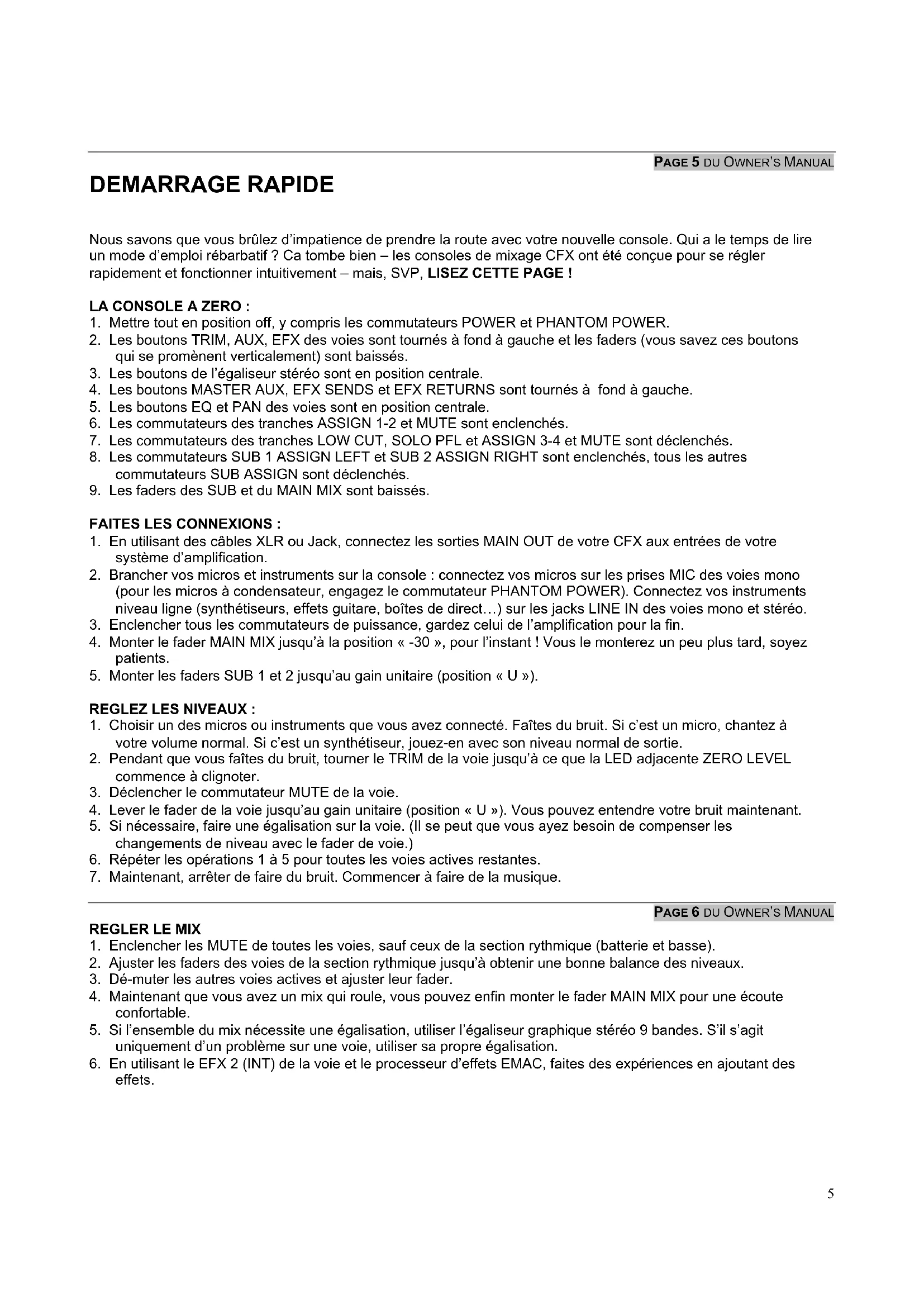 DEMARRAGE RAPIDE Nous savons que vous brûlez d’impatience de prendre la route avec votre nouvelle console. Qui a le temps de lire un mode d’emploi rébarbatif ? Ca tombe bien – les consoles de mixage CFX ont été conçue pour se régler rapidement et fonctionner intuitivement – mais, SVP, LISEZ CETTE PAGE ! LA CONSOLE A ZERO :