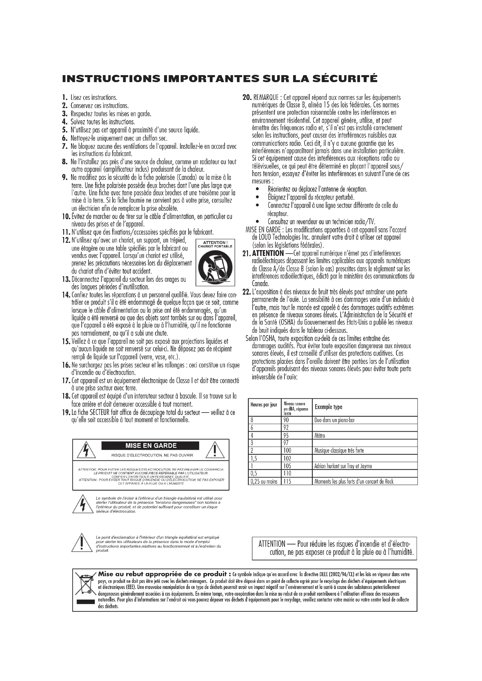 RISQUE D’ÉLECTROCUTION. NE PAS OUVRIRATTENTION : POUR EVITER LES RISQUES D’ÉLECTROCUTION, NE PAS ENLEVER LE COUVERCLE. LE PRODUIT NE CONTIENT AUCUNE PIECE RÉPÉRABLE PAR L'UTILISATEUR. CONFIER L'ENTRETIEN À UN PERSONNEL QUALIFIÉ.ATTENTION : POUR EVITER TOUT RISQUE D'INCENDIE OU D'ÉLECTROCUTION, NE PAS EXPOSERCET APPAREIL À LA PLUIE OU À L'HUMIDITÉLe symbole de l’éclair à l'intérieur d'un triangle équilatéral est utilisé pour alerter l'utilisateur de la présence "tensions dangereuses" non isolées à l'intérieur du produit, et de potentiel suffisant pour constituer un risque sérieux d'éléctrocution.Le point d'exclamation à l'intérieur d'un triangle équilatéral est employé pour alerter les utilisateurs de la présence dans le mode d’emploi d'instructions importantes relatives au fonctionnement et à l'entretien du produit. ATTENTION — Pour réduire les risques d'incendie et d'électro- cution, ne pas exposer ce produit à la pluie ou à l'humidité. Heures par jour Niveau sonore en dBA, réponse lente Exemple type 8 90 Duo dans un piano-bar