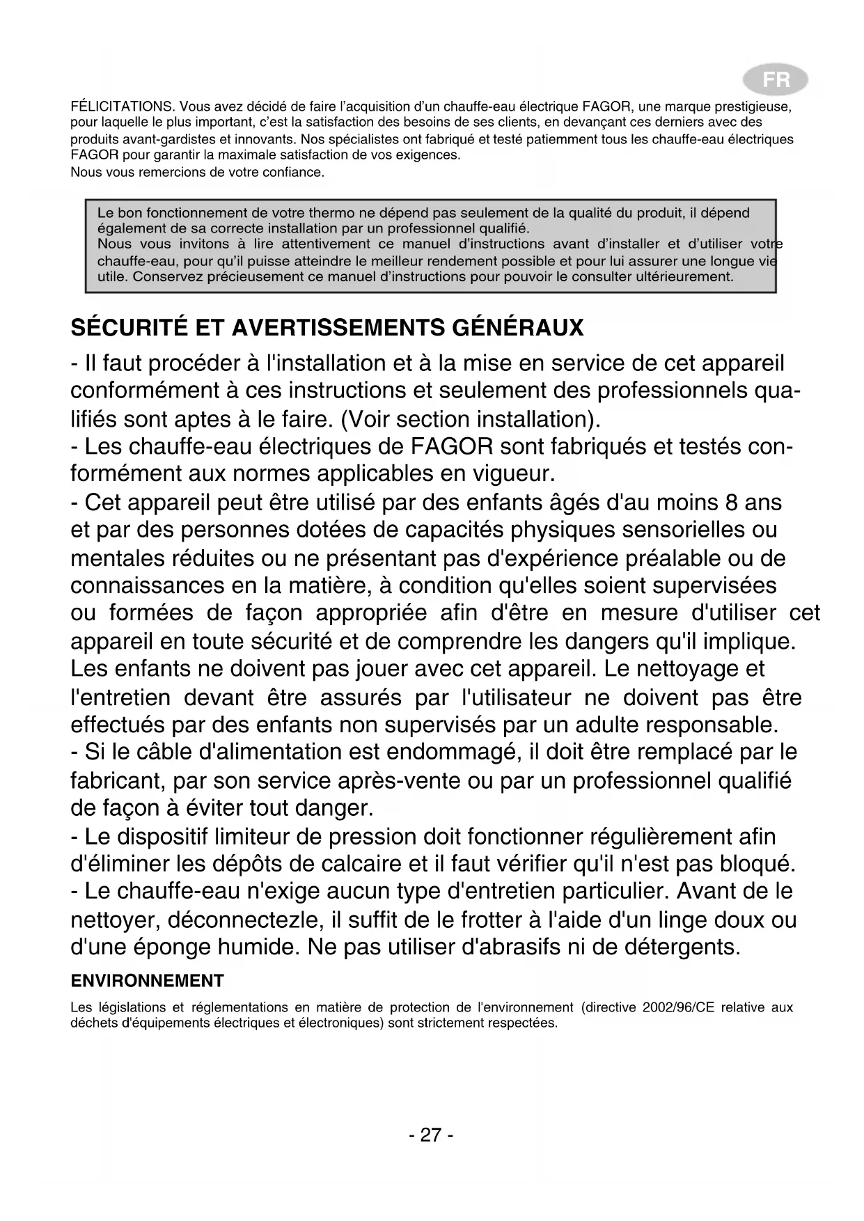 - Call the technical service.FR FÉLICITATIONS. Vous avez décidé de faire l’acquisition d’un chauffe-eau électrique FAGOR, une marque prestigieuse, pour laquelle le plus important, c’est la satisfaction des besoins de ses clients, en devançant ces derniers avec des produits avant-gardistes et innovants. Nos spécialistes ont fabriqué et testé patiemment tous les chauffe-eau électriques FAGOR pour garantir la maximale satisfaction de vos exigences. Nous vous remercions de votre confiance. SÉCURITÉ ET AVERTISSEMENTS GÉNÉRAUX - Il faut procéder à l'installation et à la mise en service de cet appareil conformément à ces instructions et seulement des professionnels qua- lifiés sont aptes à le faire. (Voir section installation). - Les chauffe-eau électriques de FAGOR sont fabriqués et testés con- formément aux normes applicables en vigueur. - Cet appareil peut être utilisé par des enfants âgés d'au moins 8 ans et par des personnes dotées de capacités physiques sensorielles ou mentales réduites ou ne présentant pas d'expérience préalable ou de connaissances en la matière, à condition qu'elles soient supervisées ou formées de façon appropriée afin d'être en mesure d'utiliser cet appareil en toute sécurité et de comprendre les dangers qu'il implique. Les enfants ne doivent pas jouer avec cet appareil. Le nettoyage et l'entretien devant être assurés par l'utilisateur ne doivent pas être effectués par des enfants non supervisés par un adulte responsable. - Si le câble d'alimentation est endommagé, il doit être remplacé par le fabricant, par son service après-vente ou par un professionnel qualifié de façon à éviter tout danger. - Le dispositif limiteur de pression doit fonctionner régulièrement afin d'éliminer les dépôts de calcaire et il faut vérifier qu'il n'est pas bloqué. - Le chauffe-eau n'exige aucun type d'entretien particulier. Avant de le nettoyer, déconnectezle, il suffit de le frotter à l'aide d'un linge doux ou d'une éponge humide. Ne pas utiliser d'abrasifs ni de détergents. ENVIRONNEMENT Les législations et réglementations en matière de protection de l'environnement (directive 2002/96/CE relative aux déchets d'équipements électriques et électroniques) sont strictement respectées.