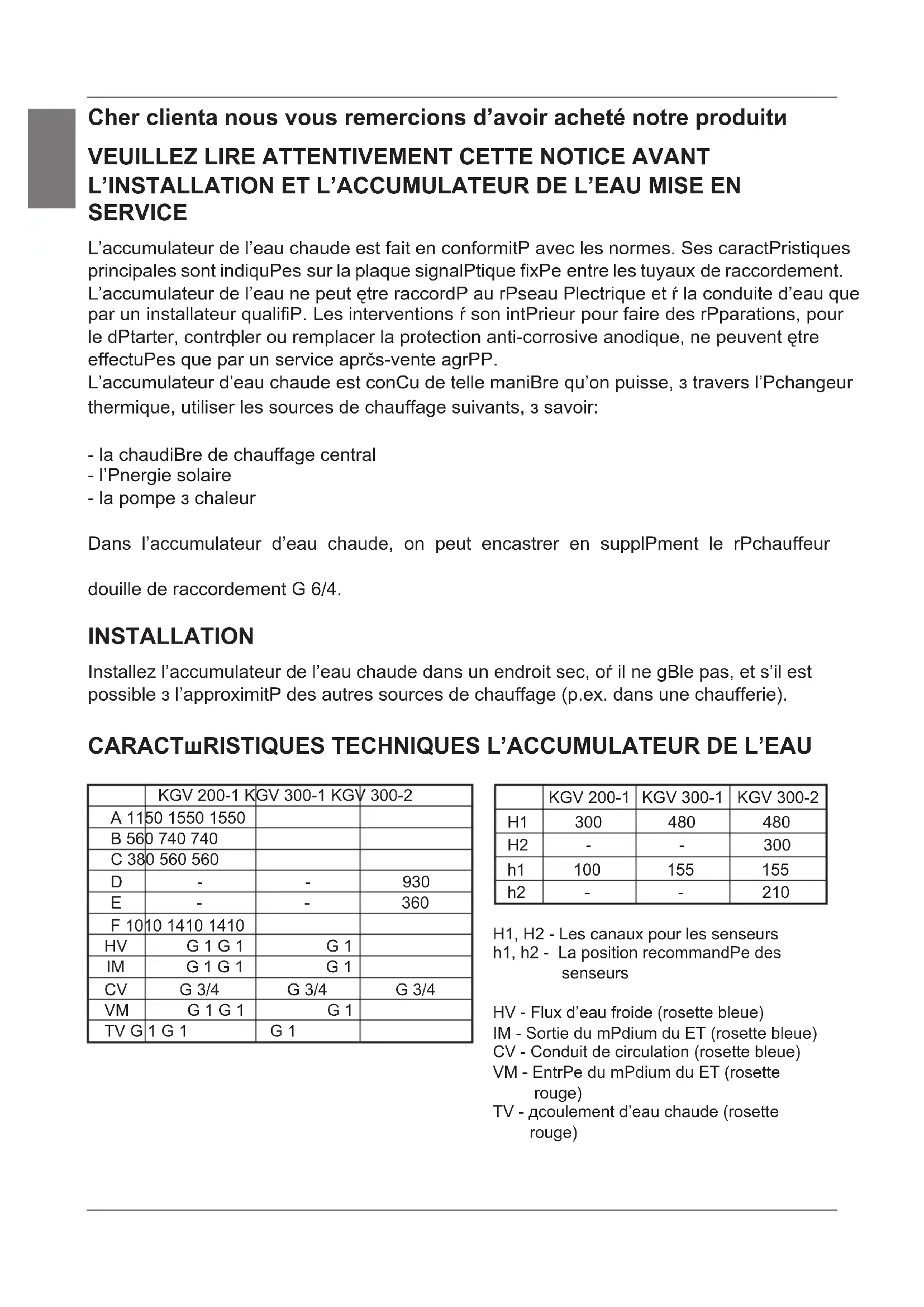 H1 300 480 480 H2 - - 300 h1 100 155 155 h2 - - 210 H1, H2 - Les canaux pour les senseurs h1, h2 - La position recommandée des senseurs HV - Flux d’eau froide (rosette bleue) IM - Sortie du médium du ET (rosette bleue) CV - Conduit de circulation (rosette bleue) VM - Entrée du médium du ET (rosette rouge) TV - Écoulement d’eau chaude (rosette rouge) m¢¥ Type KGV 200-1 KGV 300-1 KGV 300-2 Volume [l] 200 285 280 wêêêêêêêêêêêêêêêêêêêêêêêêêêêêêêêêêêêêêêêêêêê[MPa] 0,6 Poids/rempli d’eau [kg] 82 / 282 112 / 397 134 / 414 Protection anti-corrosive de la chaudière Emaillé / anode Mg